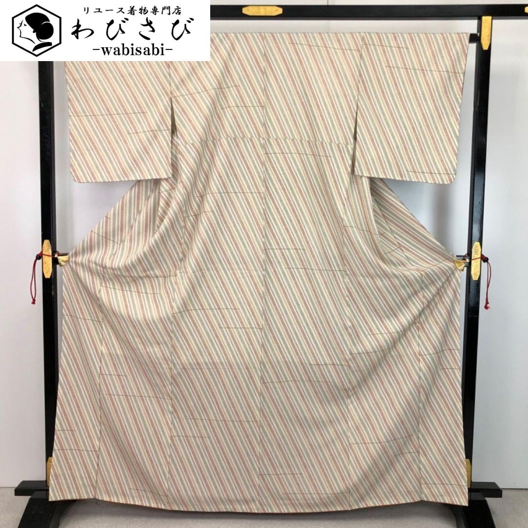 白茶色の品のあるお色味の縮緬地に多彩な色彩の斜め縞模様がデザインされた雰囲気の良い素敵なお品でございます。