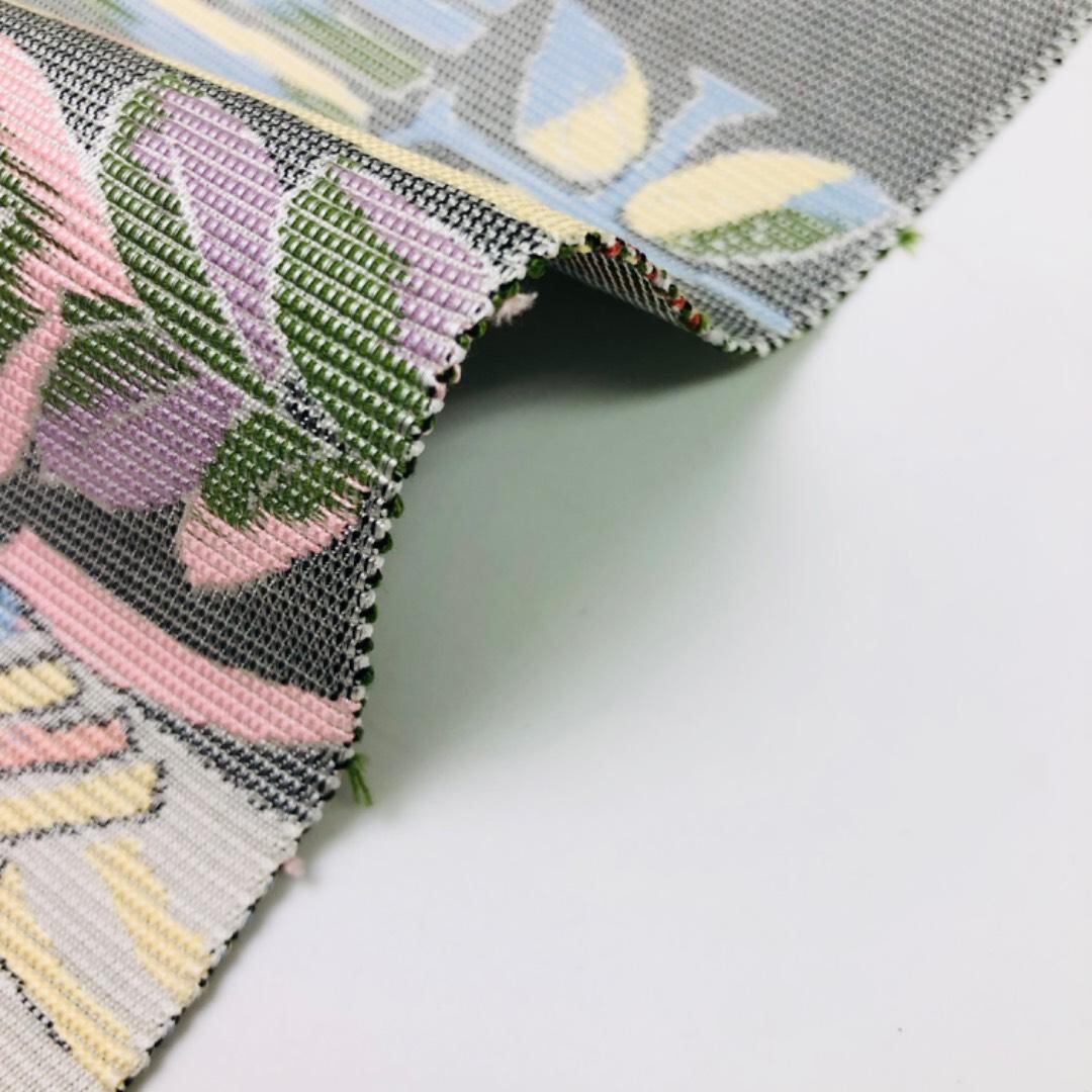 銀白色ベースのお色味に抽象花模様がデザインされた素敵なお品でございます。