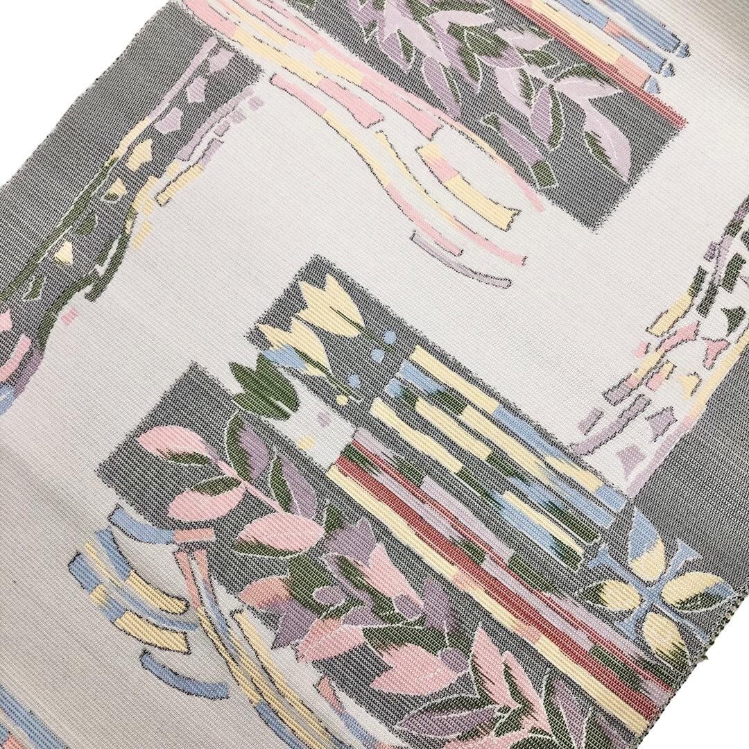 名古屋帯 抽象花模様 銀白色 長尺 O-6061 着物 きもの kimono 和服 和装 中古 リサイクル着物 【送料無料】