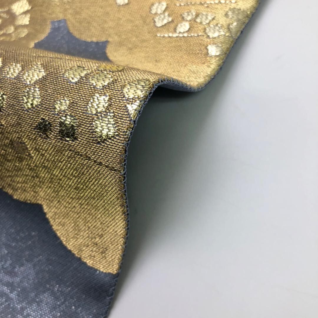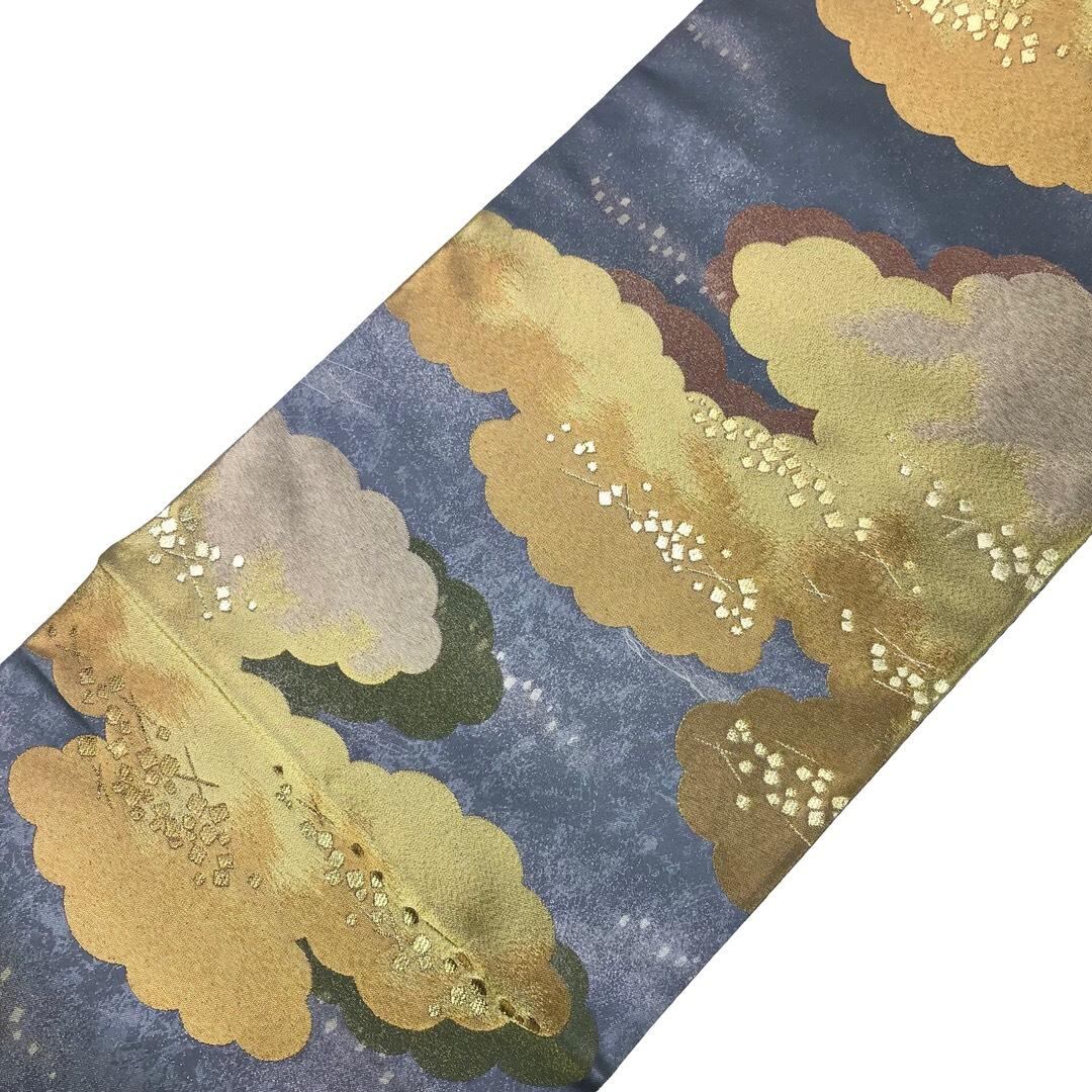 青袋鼠色のお色味に金糸の使われた煌びやかな雲柄がデザインされた素敵なお品でございます。