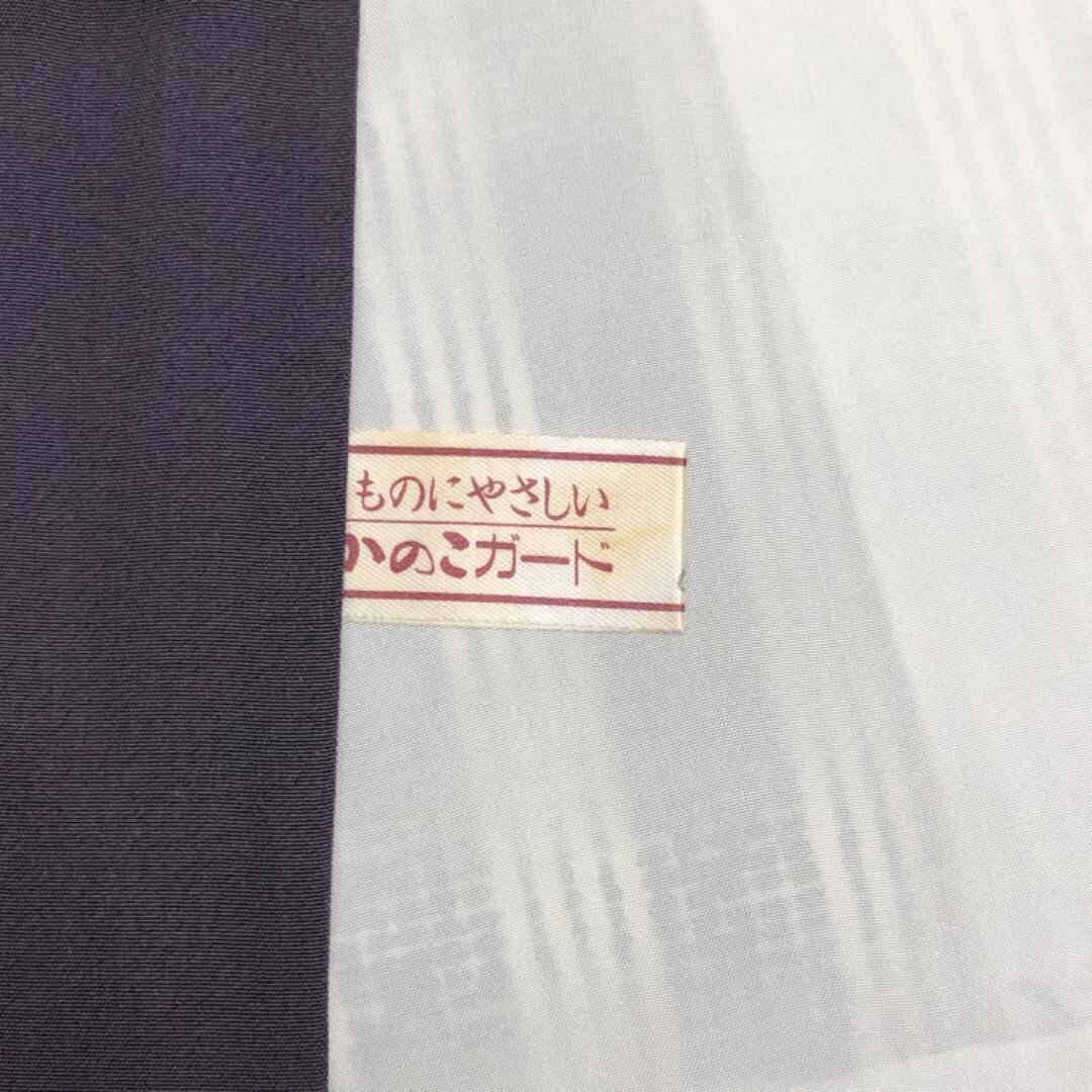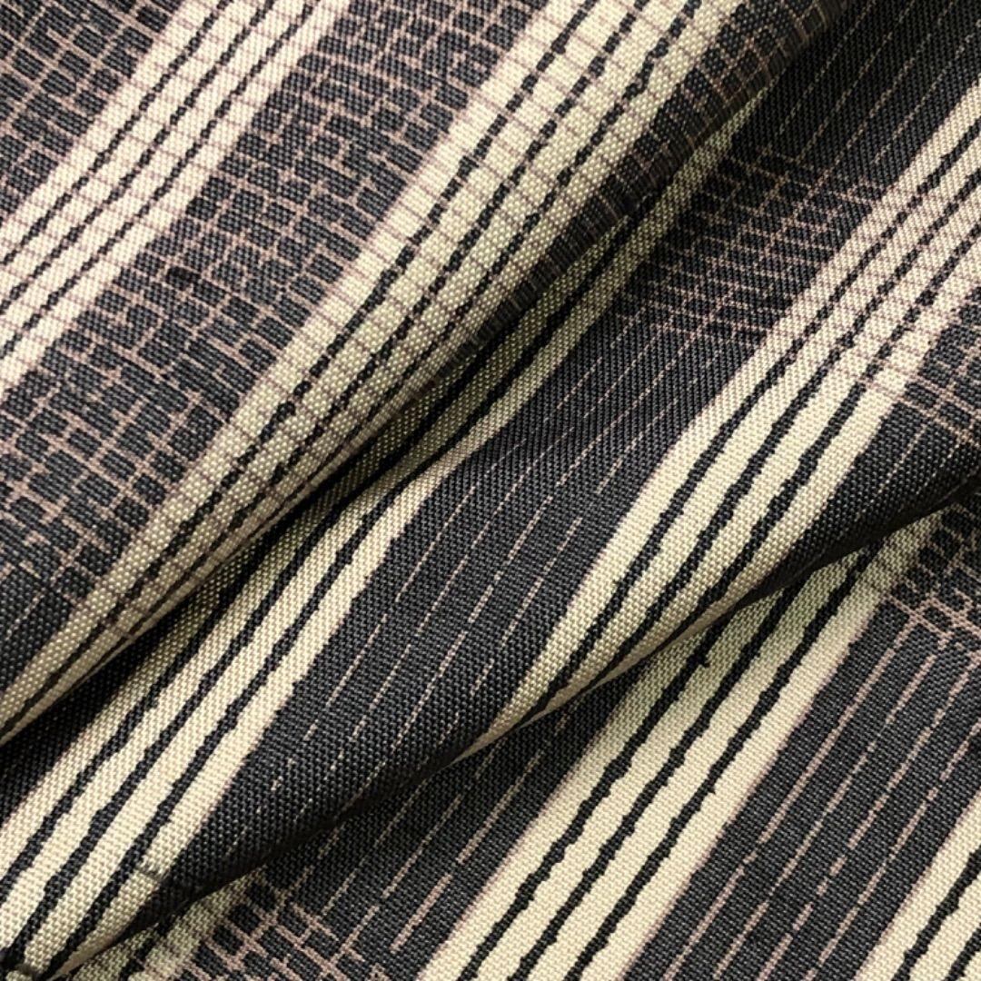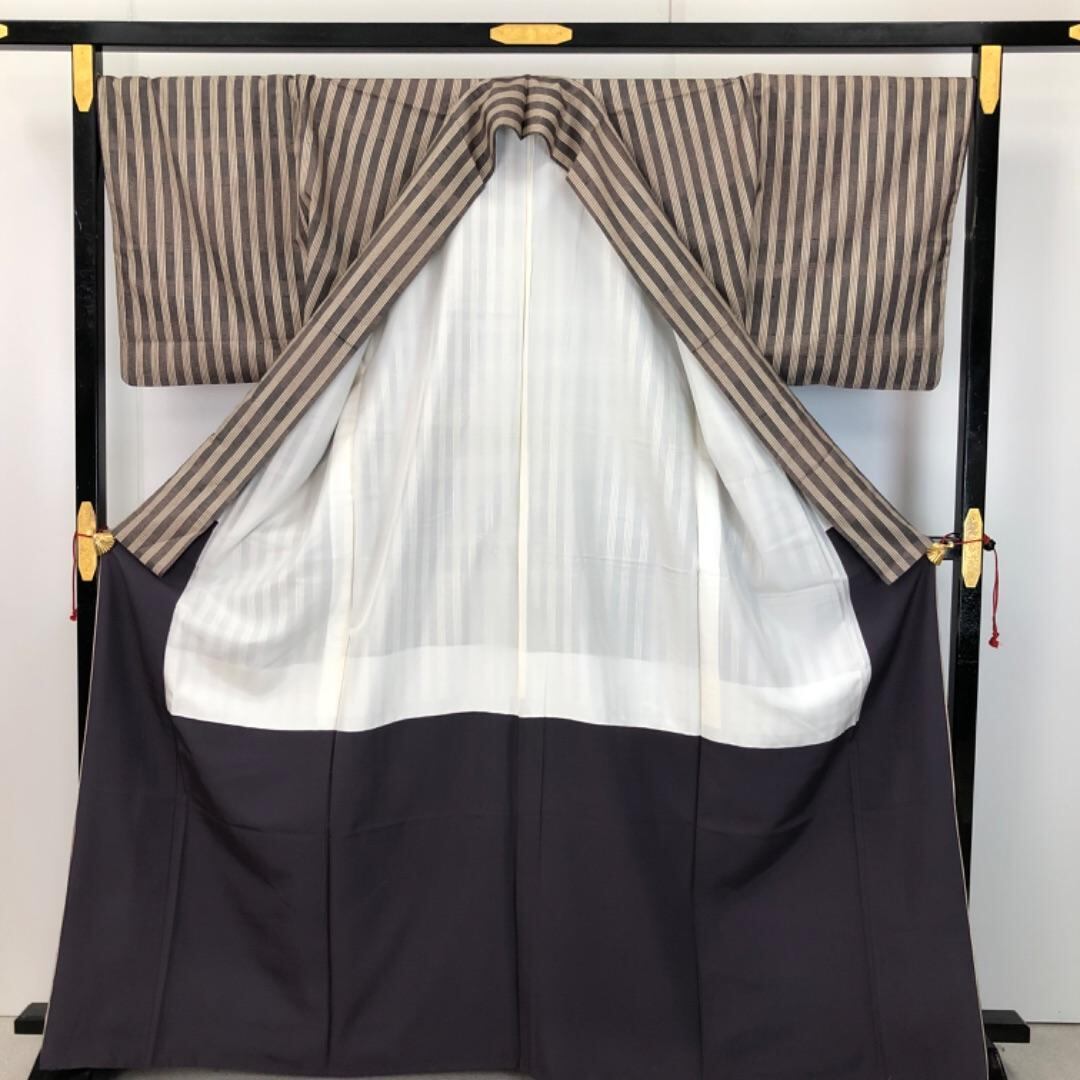鈍色ベースの雰囲気の良い色彩、縦縞模様の染めの柄裄がデザインされた雰囲気の良い素敵なお品でございます。