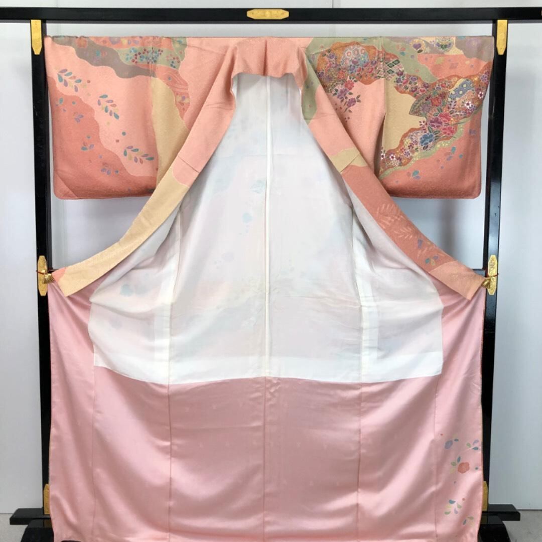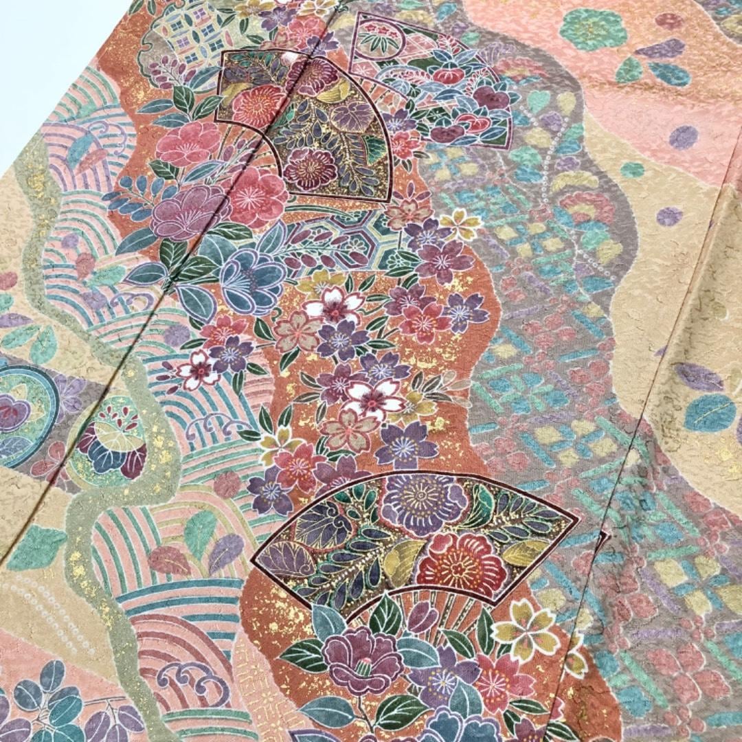 訪問着 雪輪に美しい花模様 扇子 青海波 金彩 トールサイズ K-5793 着物 きもの kimono 和服 和装 中古 リサイクル着物 【送料無料】