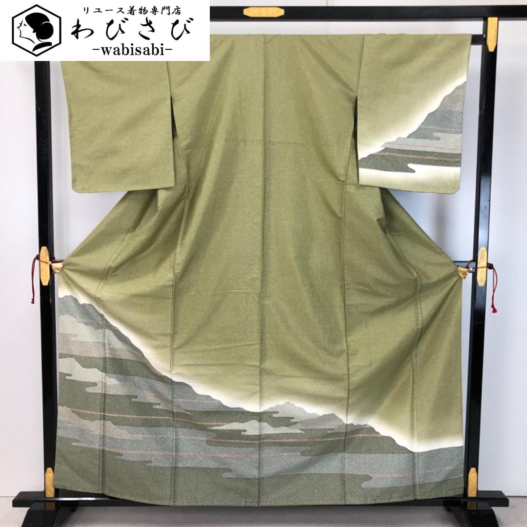 訪問着 白山紬 霞模様 暈し 根岸色 しつけ糸 K-5796 着物 きもの kimono 和服 和装 中古 リサイクル着物 【送料無料】