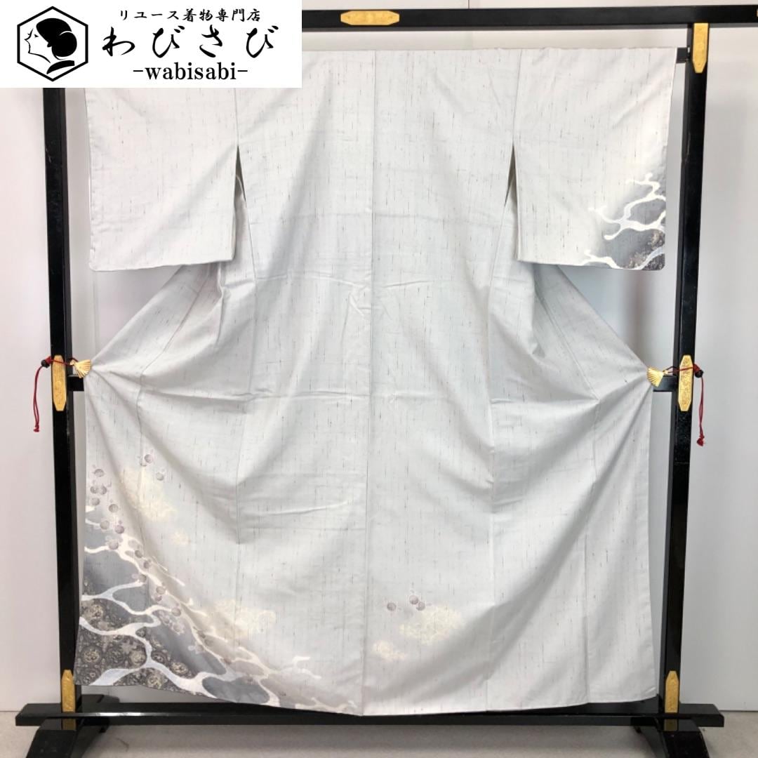 付下げ ぜんまい紬 浜辺の可愛らしい小さな海亀柄 流水 薄鼠水色 K-5785 着物 きもの kimono 和服 和装 中古 リサイクル着物 【送料無料】