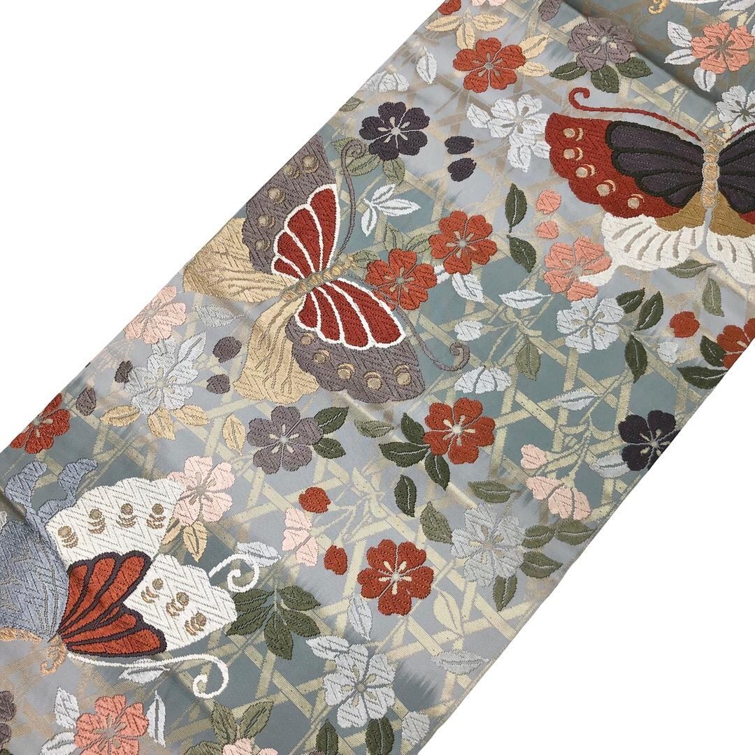 袋帯 唐織 蝶々に花模様 金糸 深川鼠色 O-6067 着物 きもの kimono 和服 和装 中古 リサイクル着物 【送料無料】