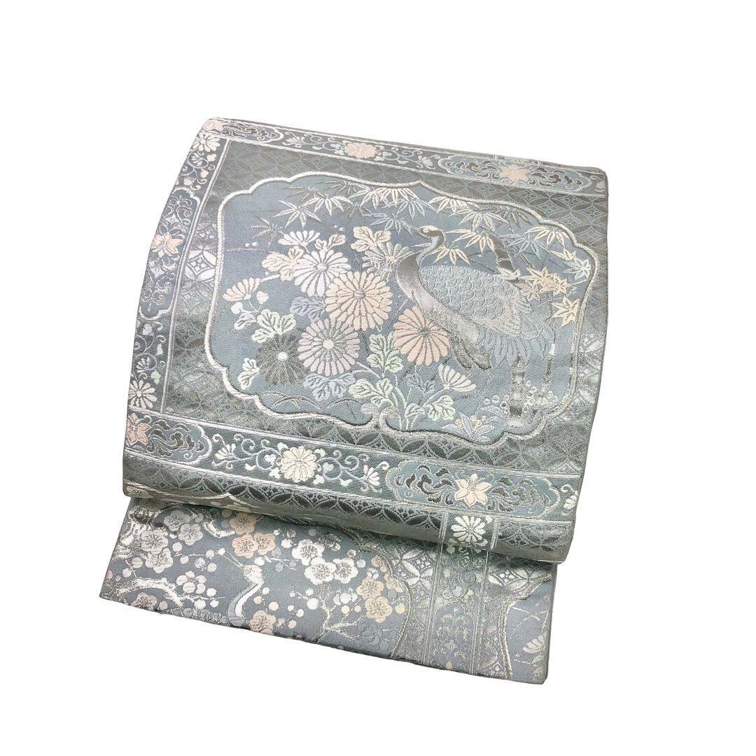 袋帯 花模様に鳥 花七宝 菊 梅 銀糸 空鼠色 O-6024 着物 きもの kimono 和服 和装 中古 リサイクル着物 【送料無料】