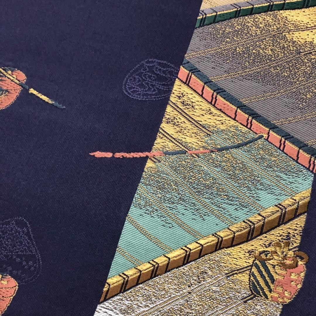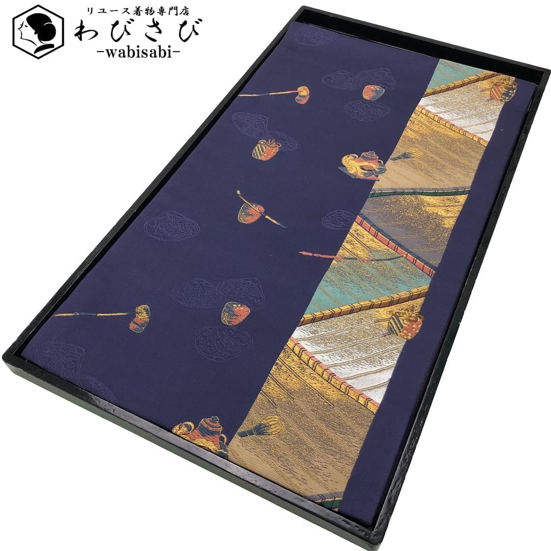 袋帯 茶道具柄 茶器 柄杓 仕覆 茶筅 金銀糸 桔梗納戸色 O-6078 着物 きもの kimono 和服 和装 中古 リサイクル着物 【送料無料】