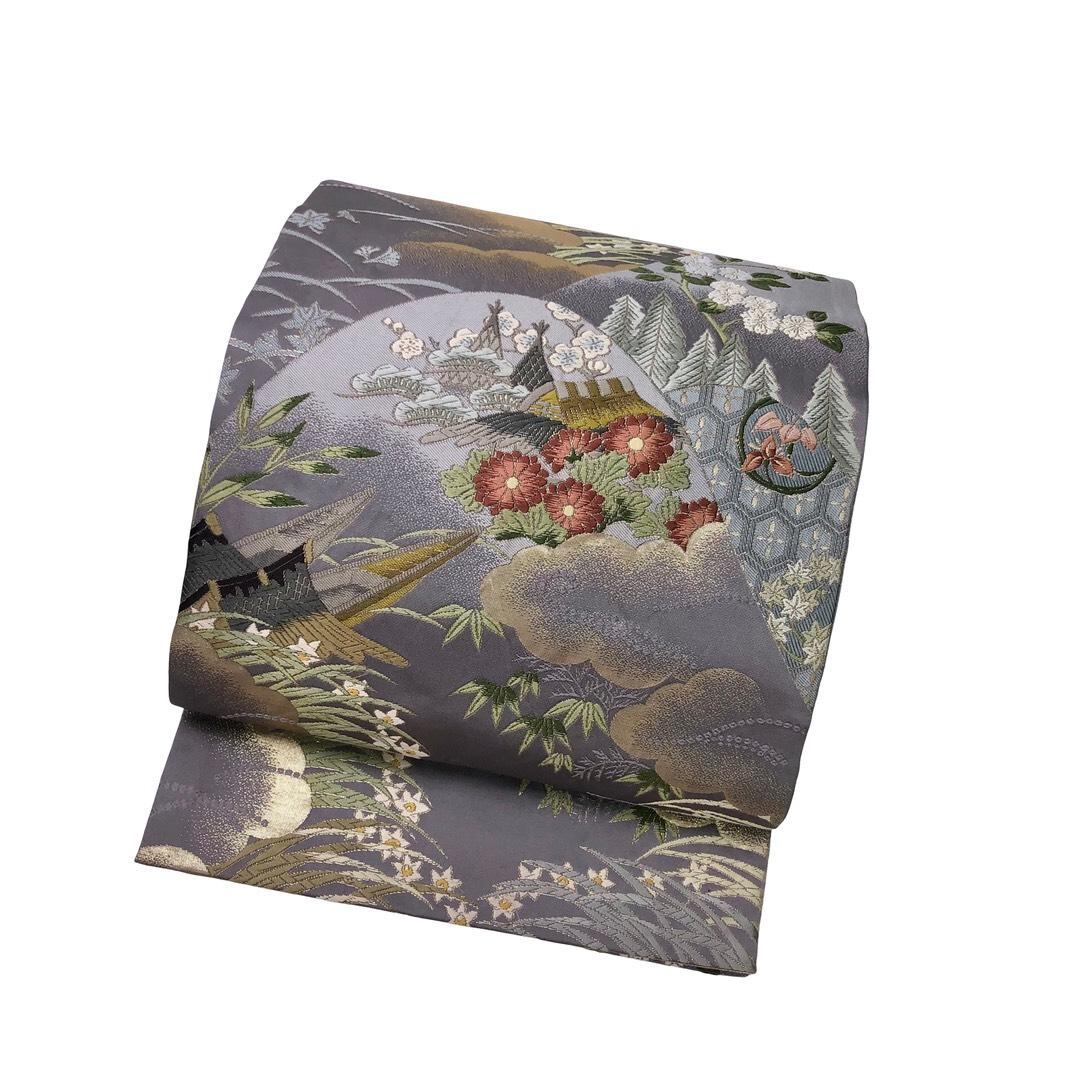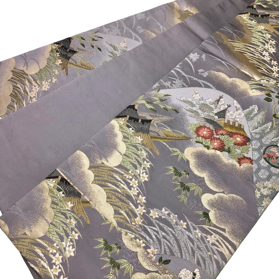 袋帯 山々の風景に花模様 金銀糸 藤鼠色 O-6065 着物 きもの kimono 和服 和装 中古 リサイクル着物 【送料無料】