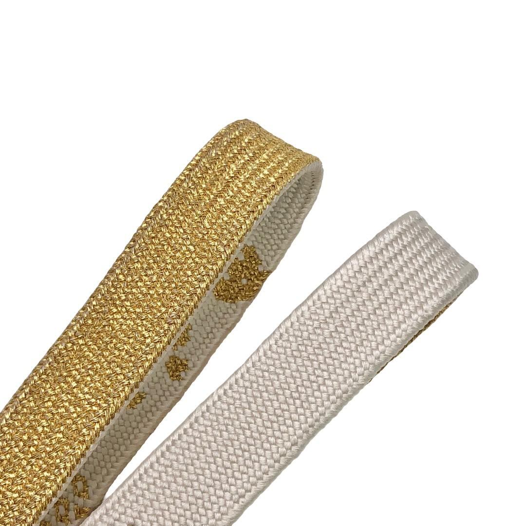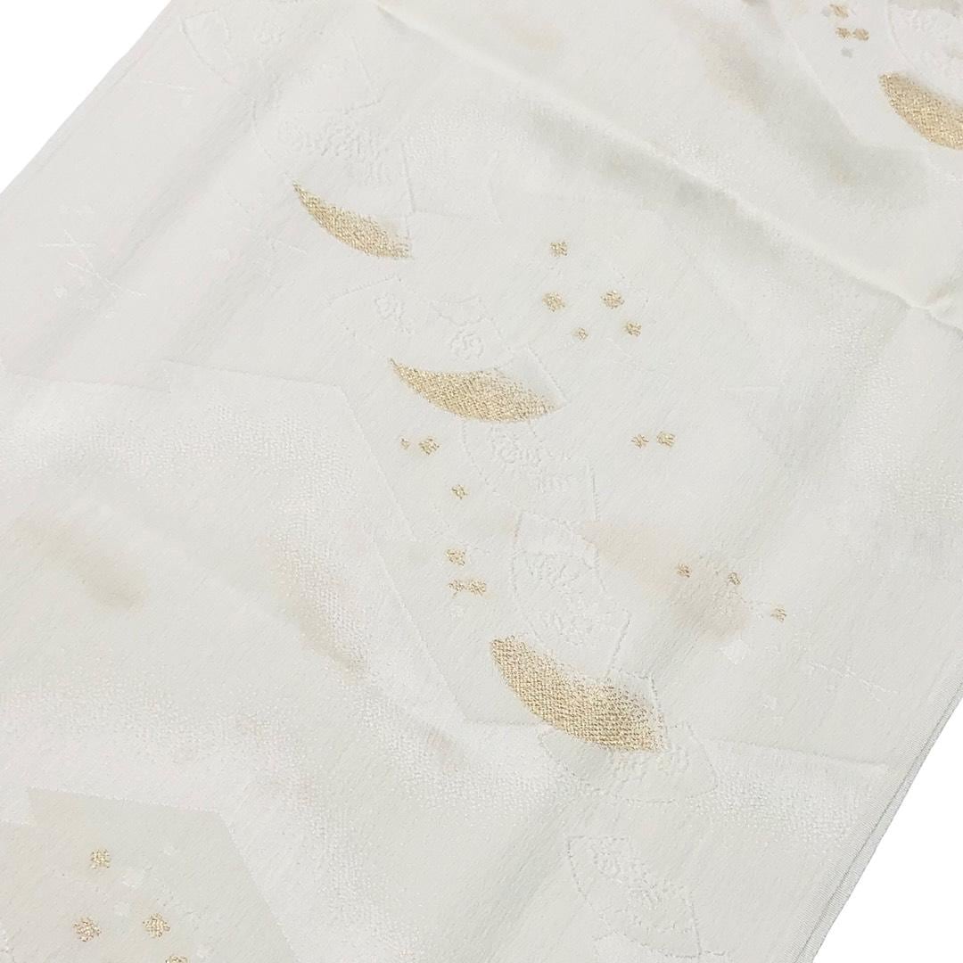 乳白色のお色味に松皮菱、地紙の柄裄がデザインされた帯揚げ、高麗組の帯締めの素敵なお品でございます。