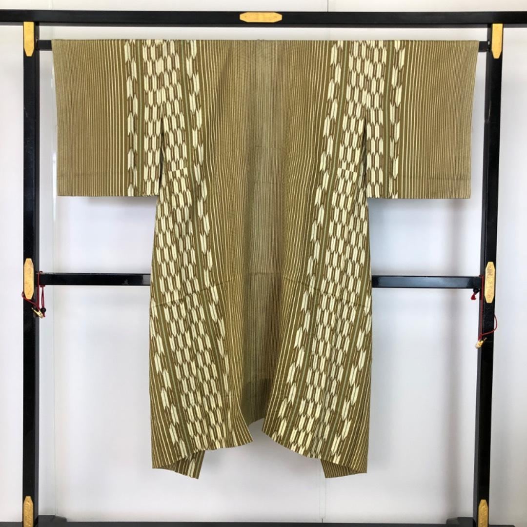路考茶色のお色味に縦縞模様に矢羽の柄裄がデザインされた素敵なお品でございます。