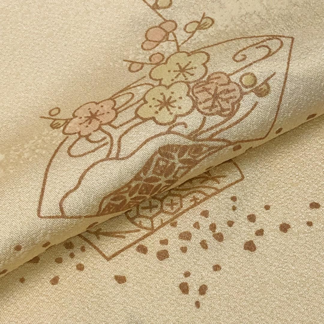 薄卵色のお色味に地紙に花模様の柄裄がデザインされた素敵なお品でございます。