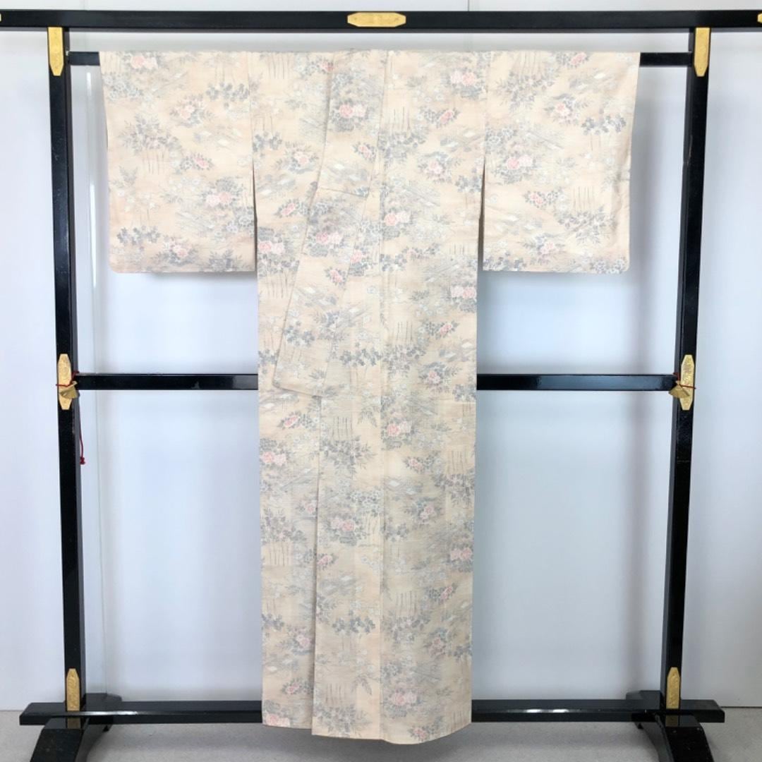 紬着物 おじや紬 草花模様 練色 K-5810 着物 きもの kimono 和服 和装 中古 リサイクル着物 【送料無料】