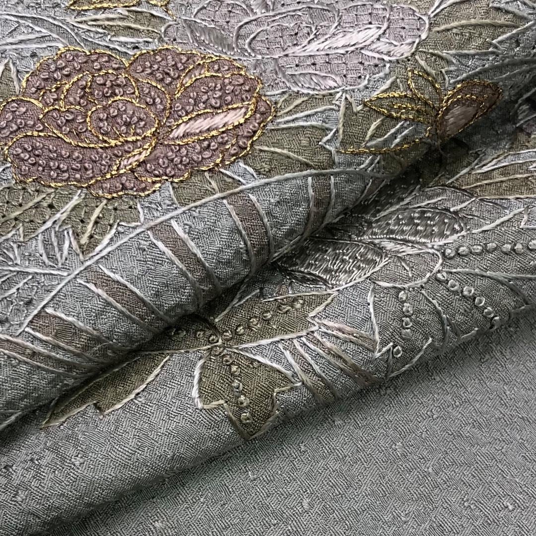 灰色のお色味に扇子に花模様などの刺繍柄がデザインされた素敵なお品でございます。