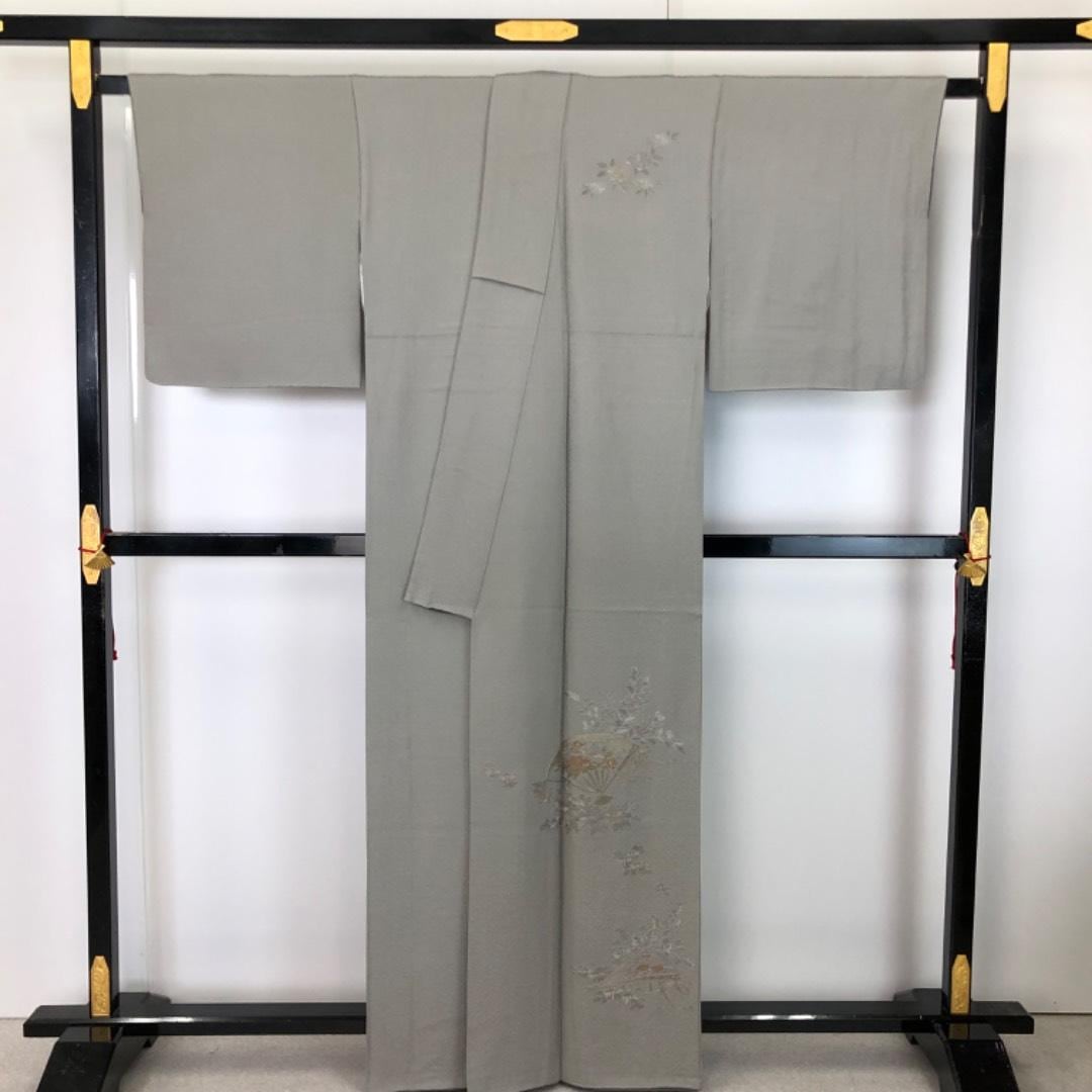 付下げ 中国刺繍 相良刺繍 汕頭刺繍 扇子に花模様 灰色 縮緬 K-5812 着物 きもの kimono 和服 和装 中古 リサイクル着物 【送料無料】