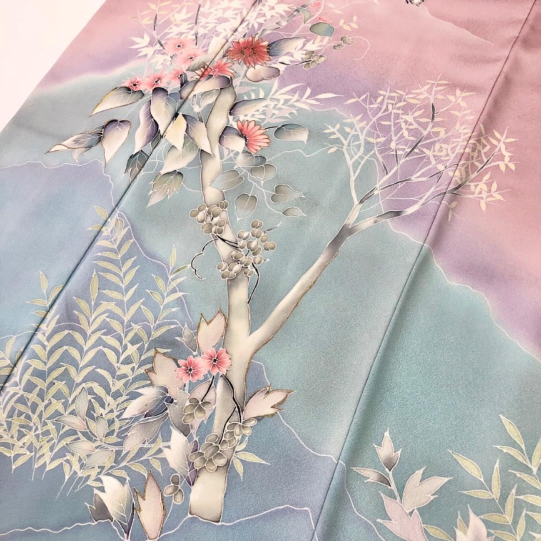 白梅色ベースの染分けのお色味に美しい花模様がデザインされた上品で素敵なお品でございます。