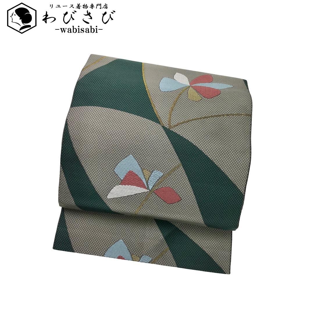 名古屋帯 花模様 金糸 灰色 O-6080 着物 きもの kimono 和服 和装 中古 リサイクル着物 【送料無料】