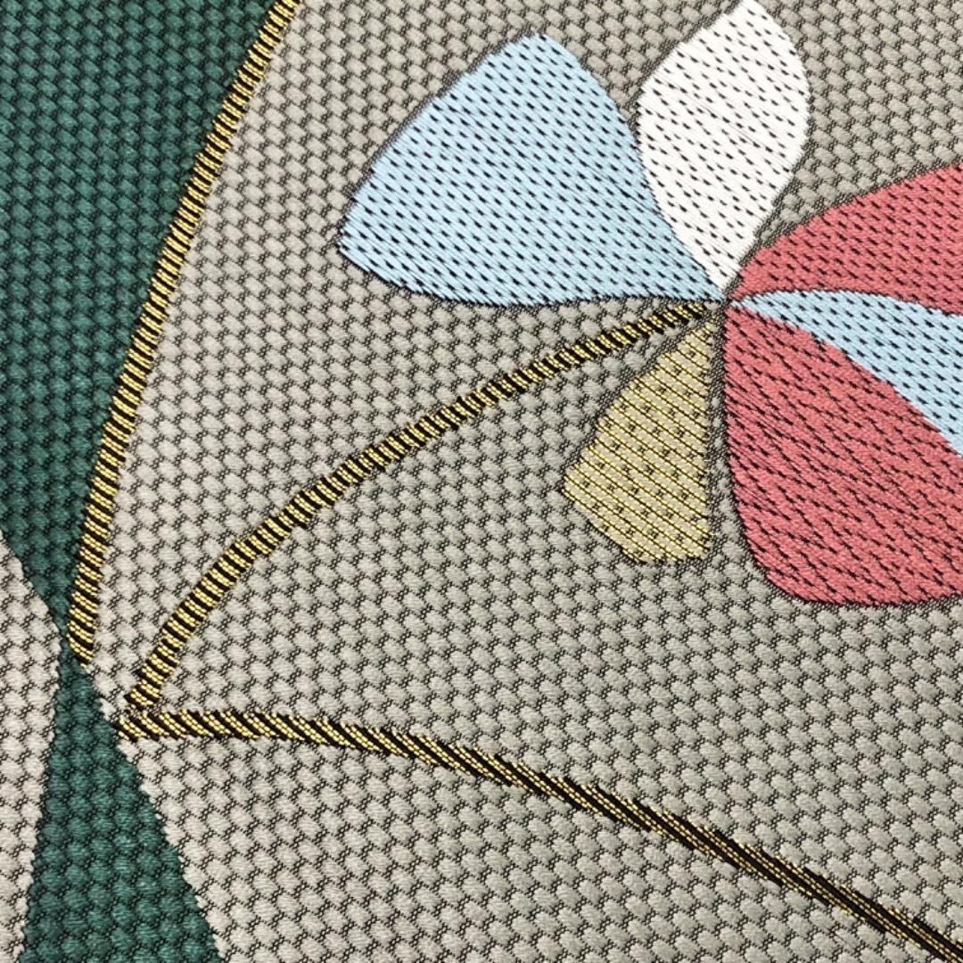 灰色に緑色ベースのお色味に花模様がデザインされた素敵なお品でございます。