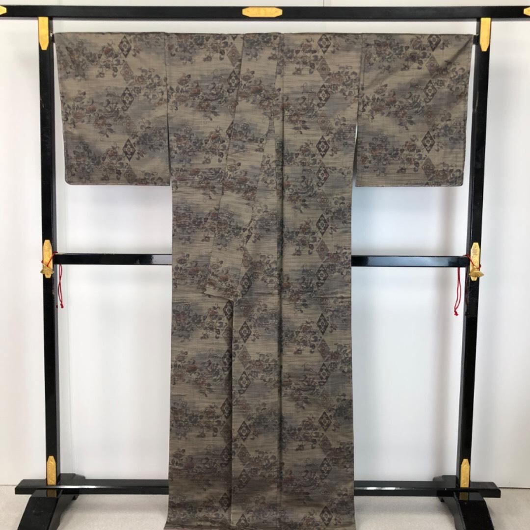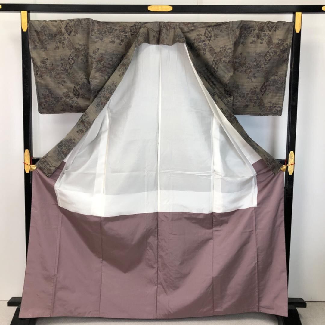 紬着物 華美人 花唐草模様 しつけ糸 トールサイズ K-5846 着物 きもの kimono 和服 和装 中古 リサイクル着物 【送料無料】