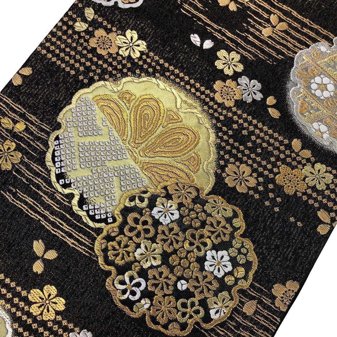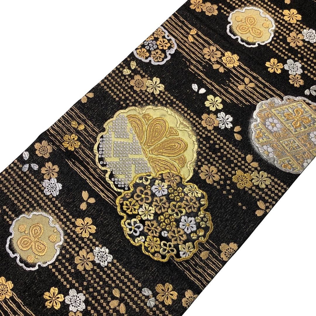 袋帯 雪輪に花模様 花菱 ねじり梅 桜 金銀糸 黒色 ガード加工 O-6092 着物 きもの kimono 和服 和装 中古 リサイクル着物 【送料無料】