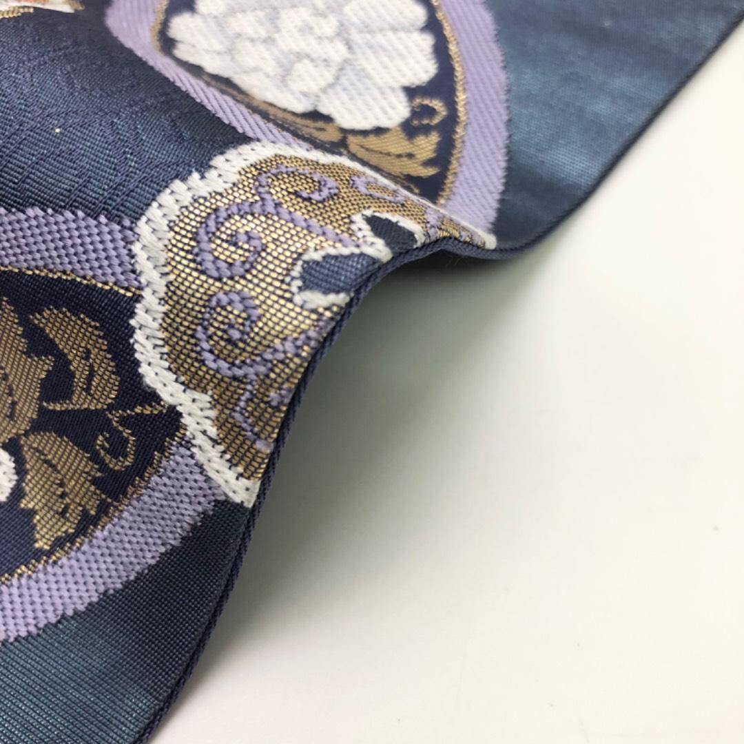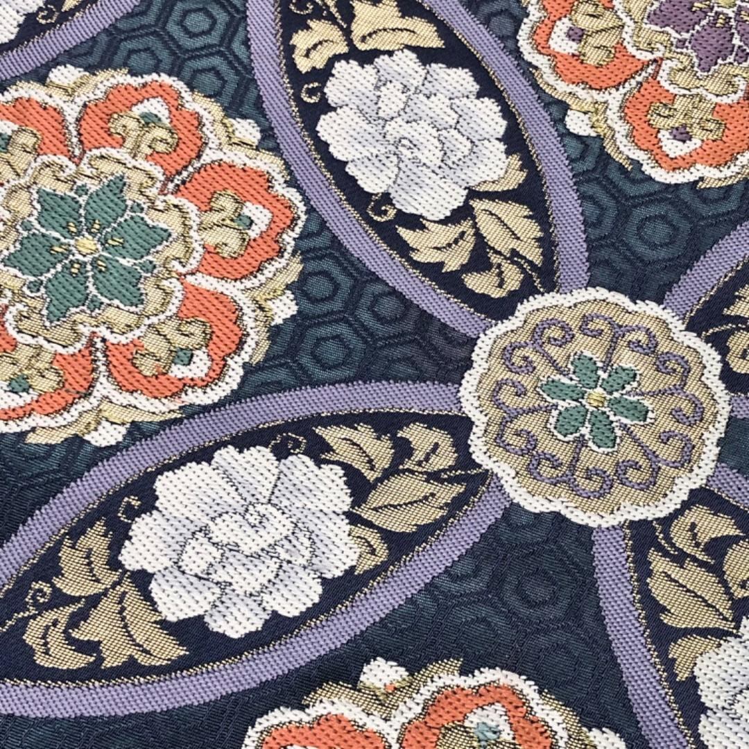 袋帯 七宝亀甲詰華文 花唐草模様 金糸 暝色 O-6096 着物 きもの kimono 和服 和装 中古 リサイクル着物 【送料無料】