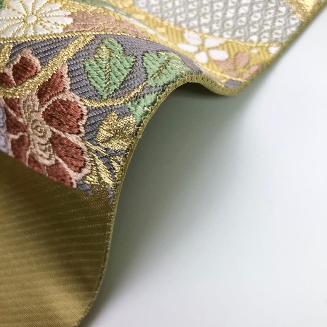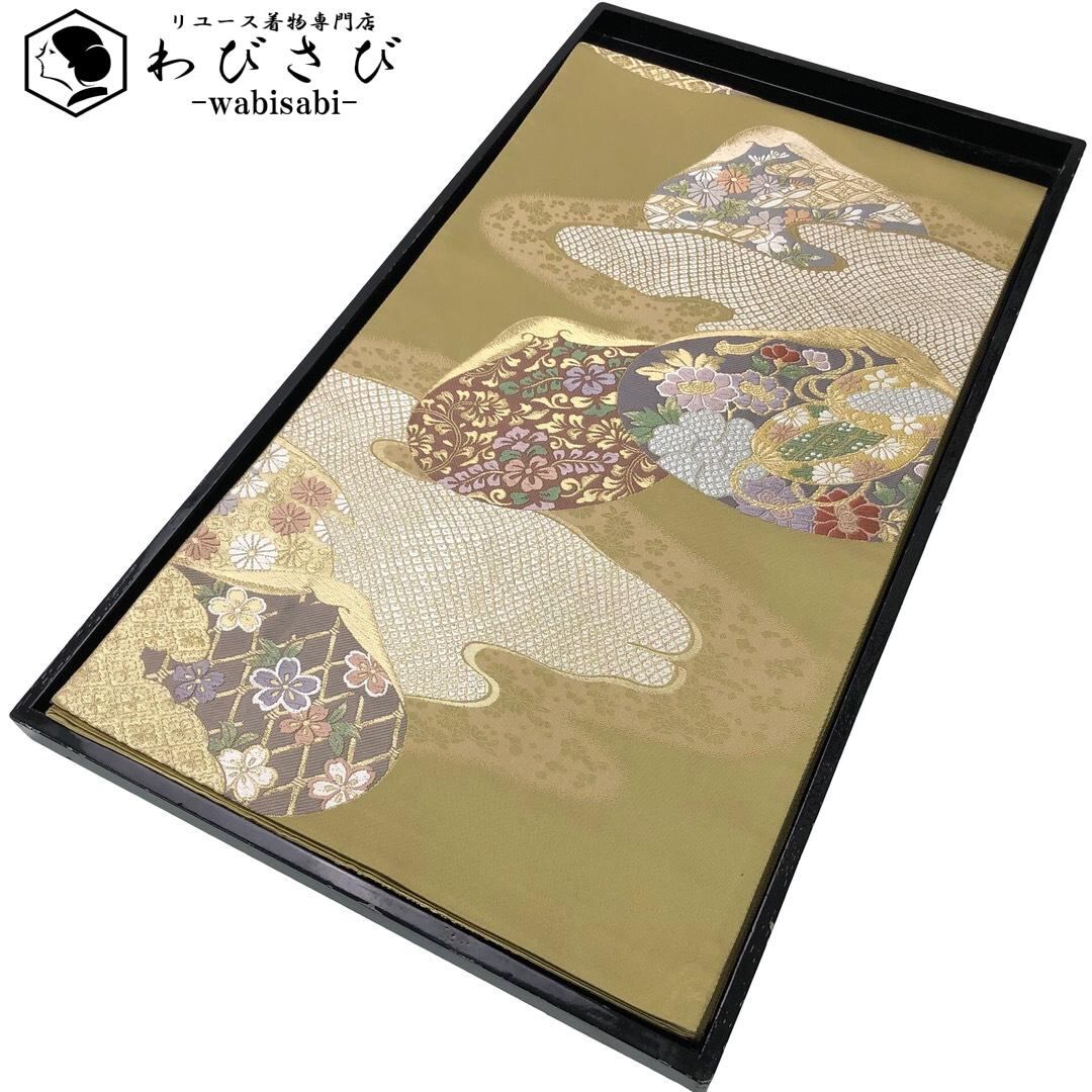 袋帯 貝合せ 七宝に花模様 霞模様 金糸 国防色 O-6098 着物 きもの kimono 和服 和装 中古 リサイクル着物 【送料無料】