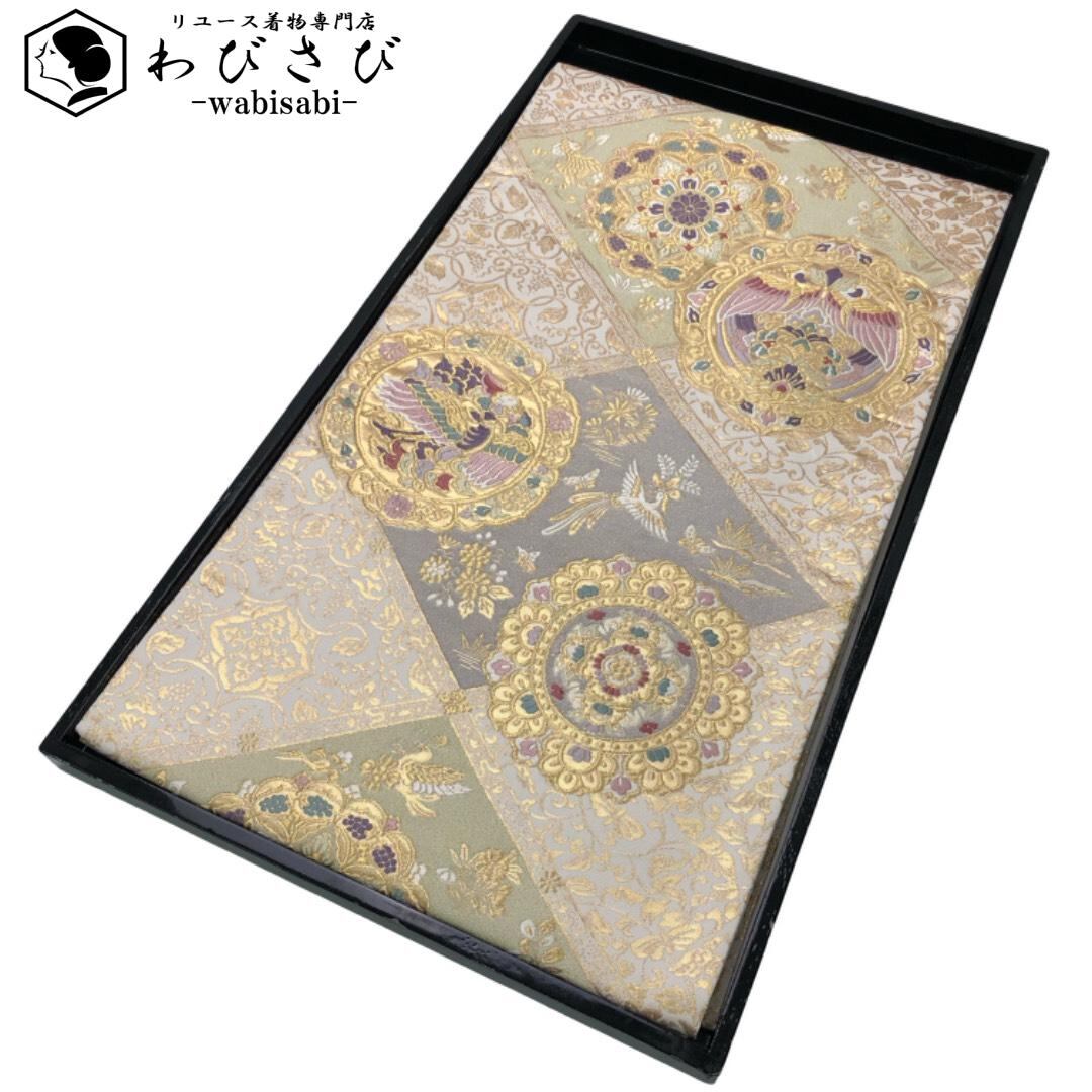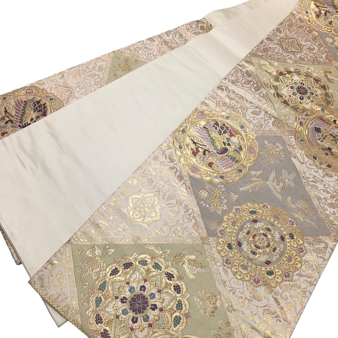袋帯 華柄模様 鳳凰 菱形 唐草模様 薄練色 O-6087 着物 きもの kimono 和服 和装 中古 リサイクル着物 【送料無料】
