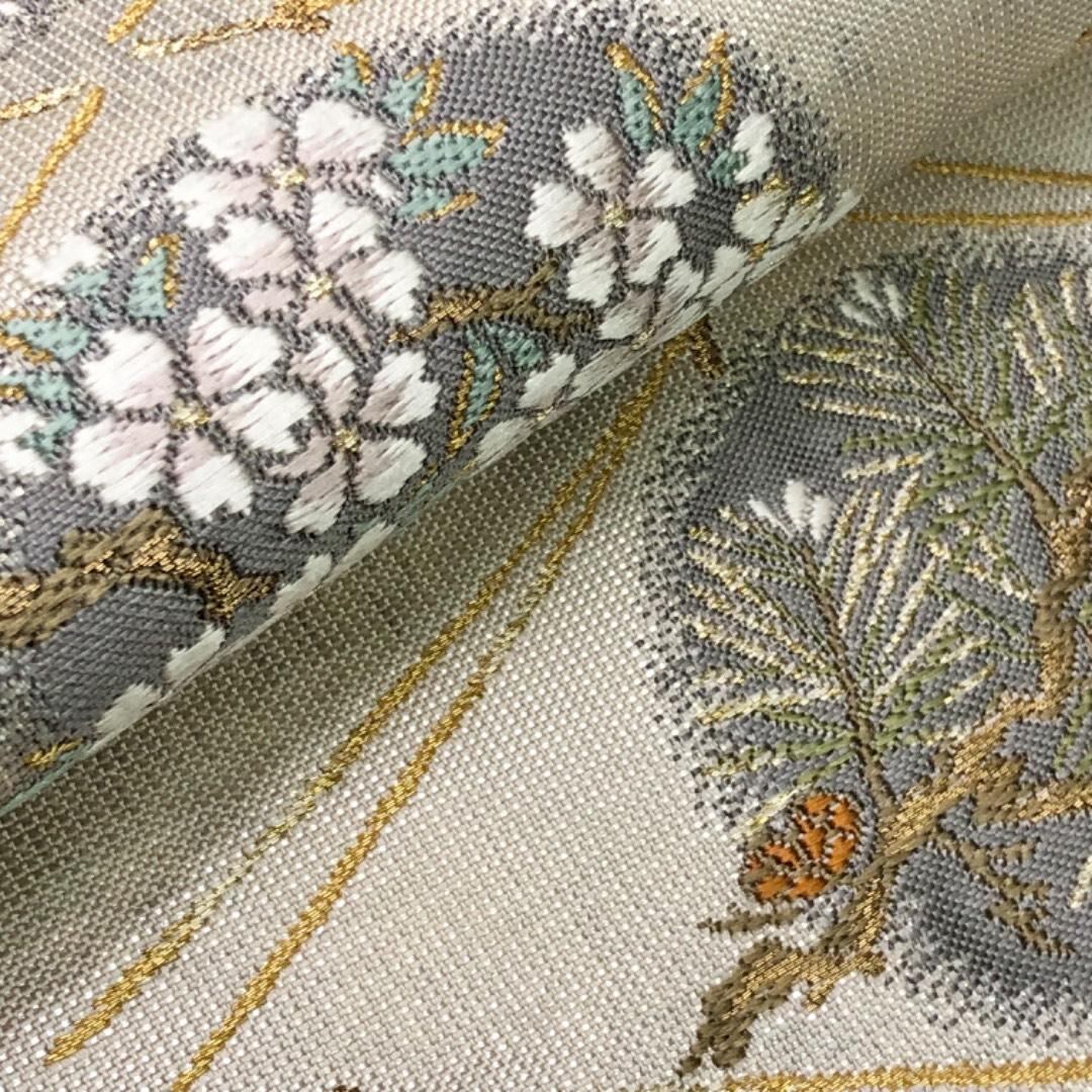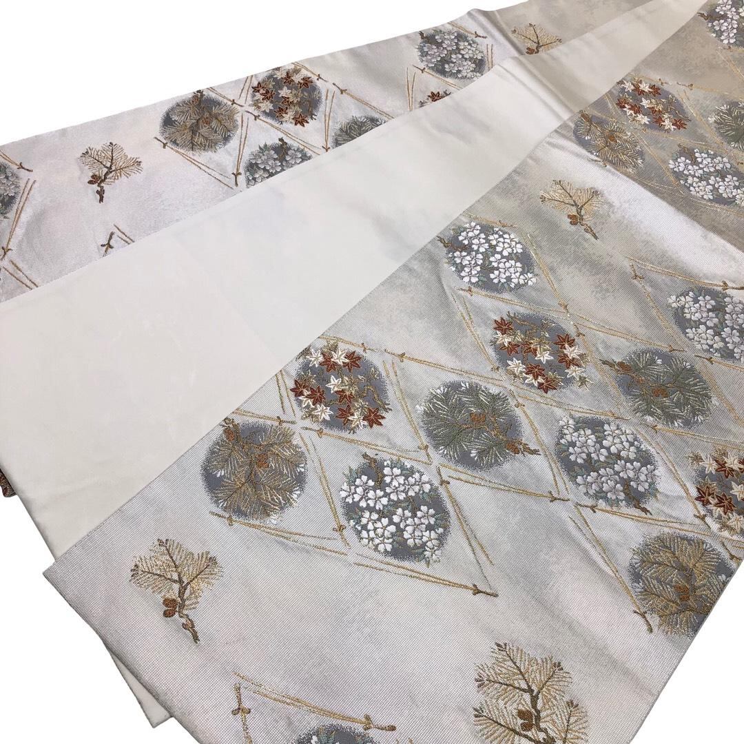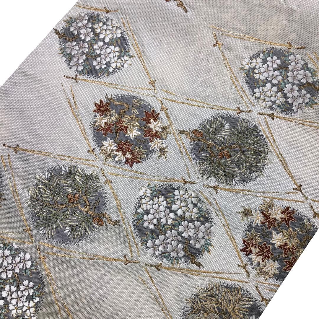 袋帯 丸に花模様 菱形 松葉 松ぼっくり 紅葉 桜 金銀糸 貝粉色 O-6075 着物 きもの kimono 和服 和装 中古 リサイクル着物 【送料無料】