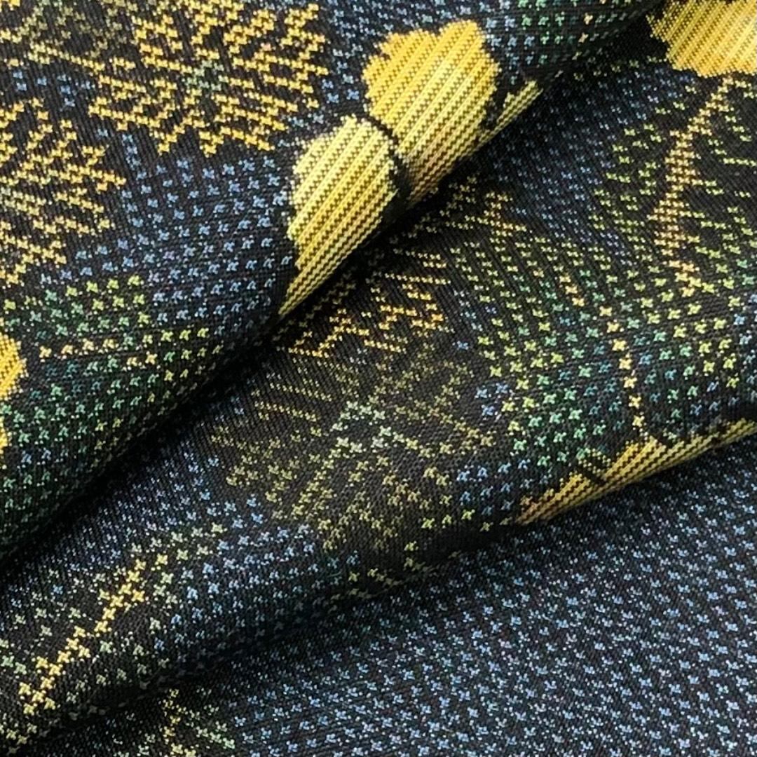 落ち着きある藍色のお色味に黄色味の花模様がデザインされた雰囲気の良い素敵なお品でございます。