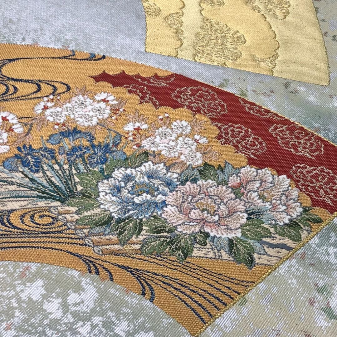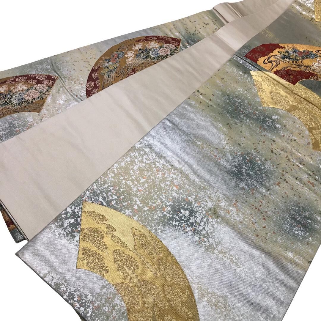 銀色ベースの煌びやかなお色味に地紙に花模様、流水などがデザインされた素敵なお品でございます。