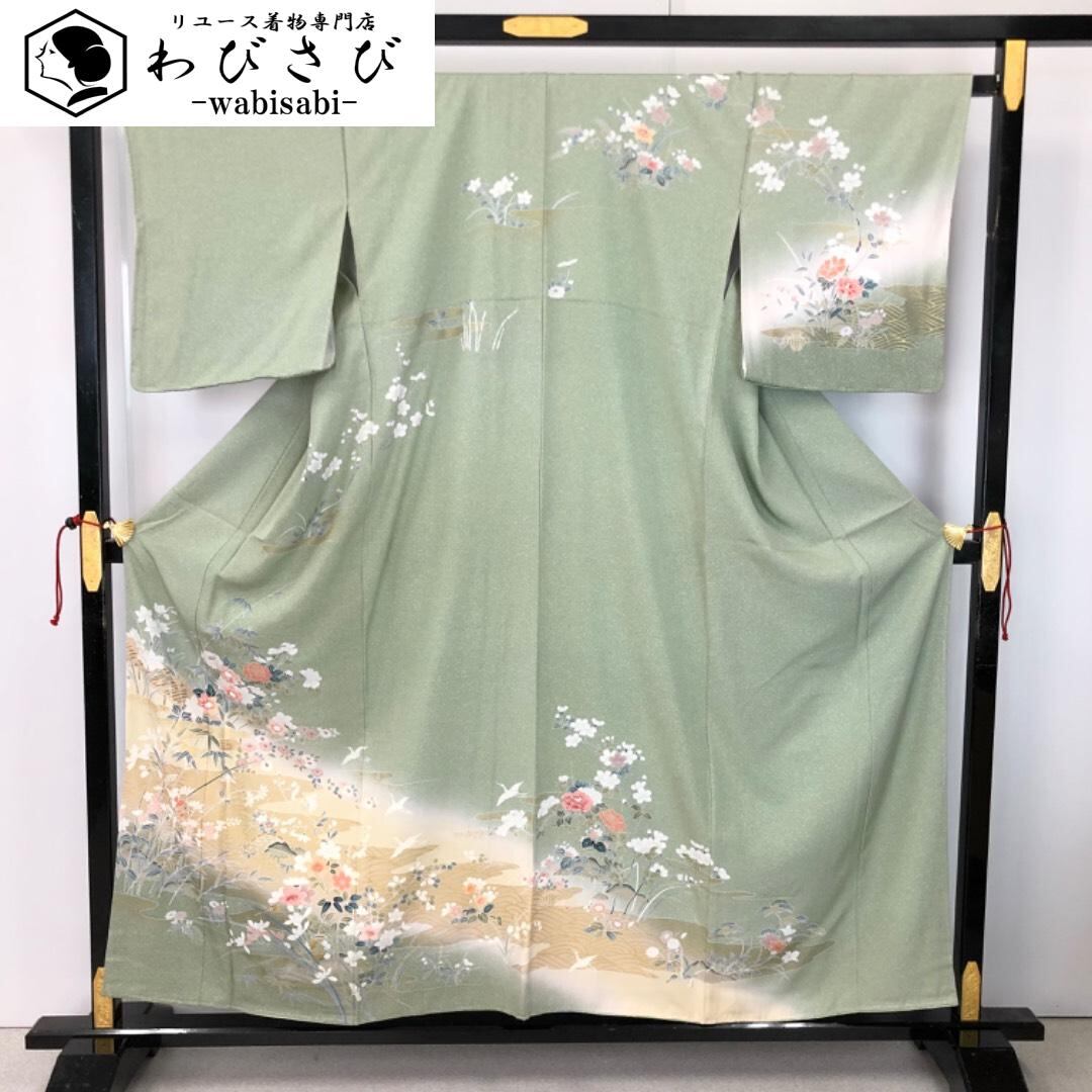 訪問着 友禅 美しい花模様 鶴 叩き染 金彩 西武お誂え しつけ糸 K-5859 着物 きもの kimono 和服 和装 中古 リサイクル着物 【送料無料】