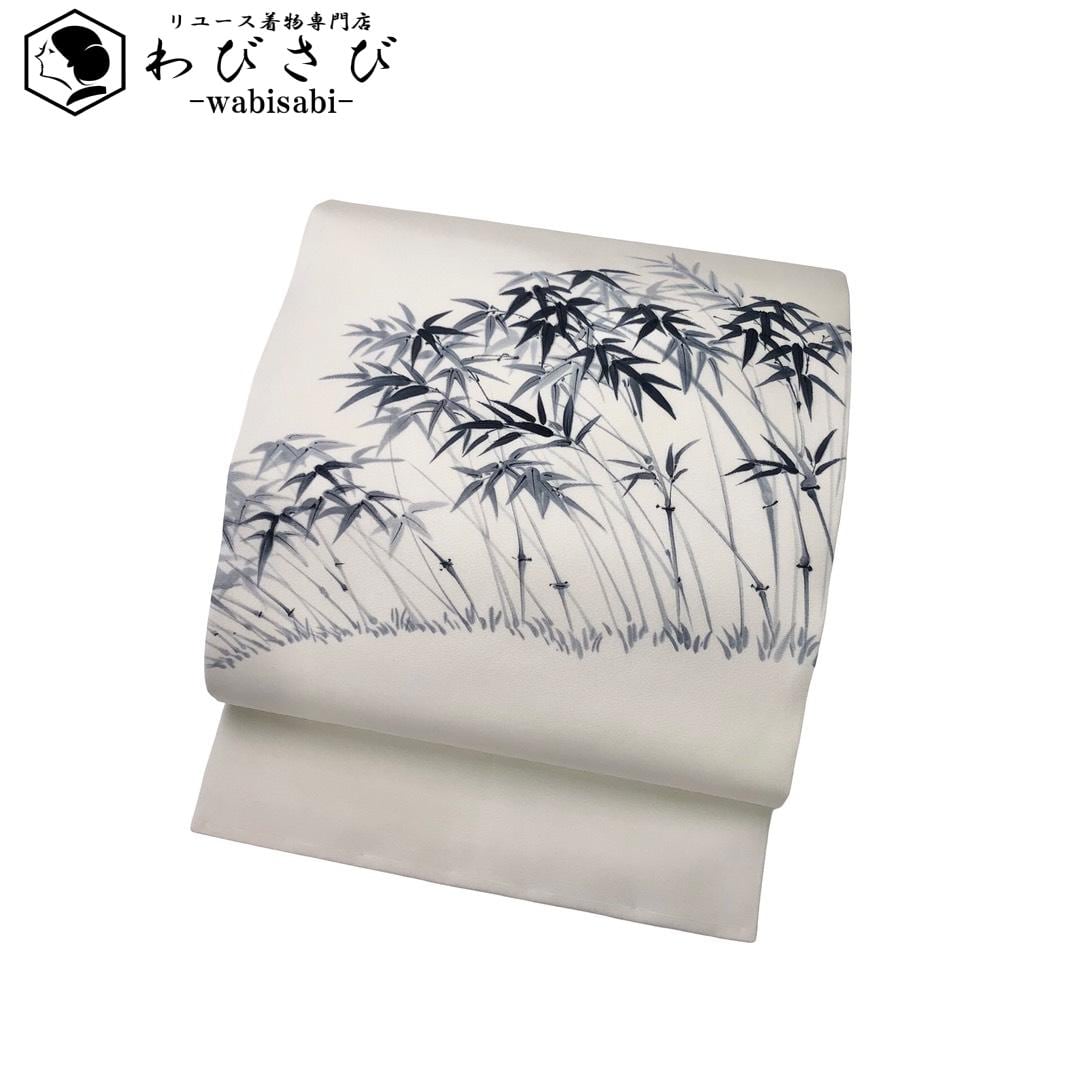 名古屋帯 作家物 塩瀬 手描き 笹模様 乳白色 しつけ糸 O-6159 着物 きもの kimono 和服 和装 中古 リサイクル着物 【送料無料】