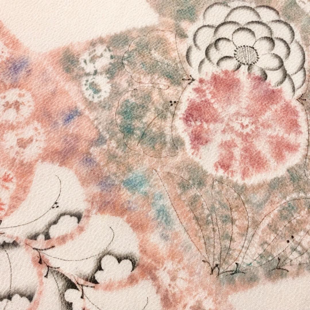乳白色の品のあるお色味に辻が花絞りの柄裄がデザインされた雰囲気の良い素敵なお品でございます。