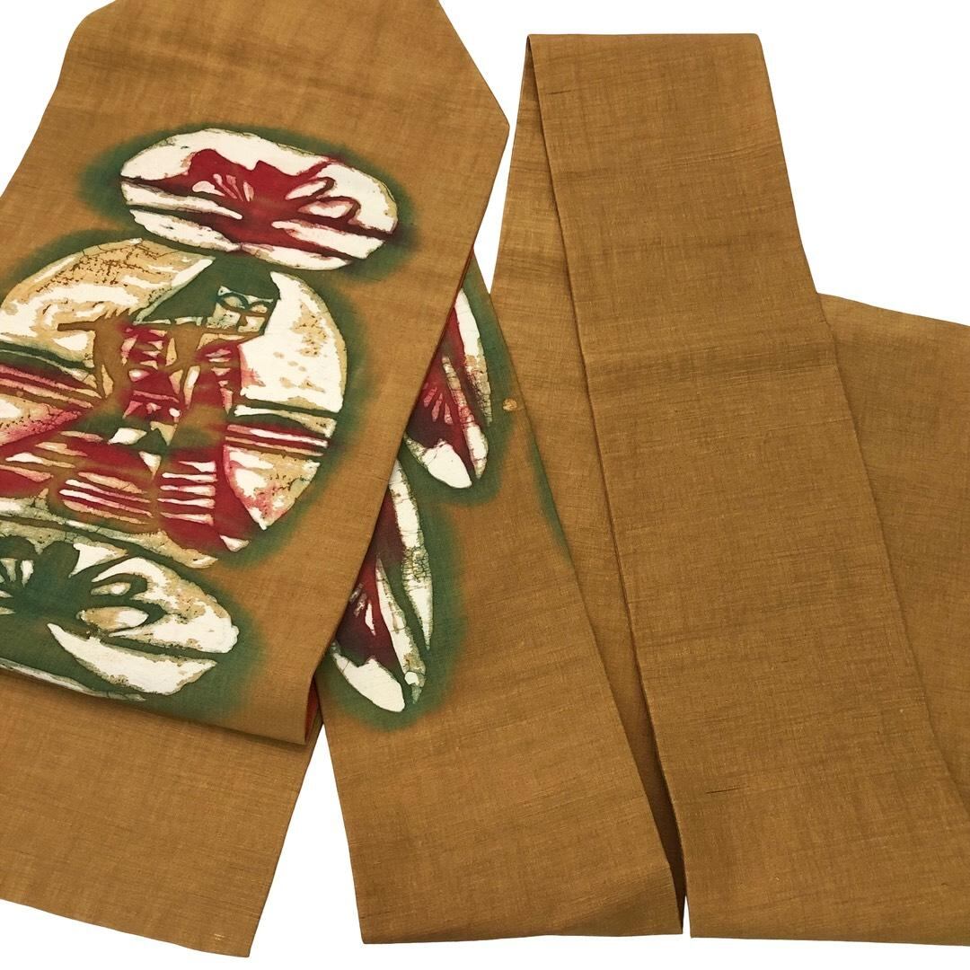 名古屋帯 紬 笛を吹く少女 黄茶色 O-6167 着物 きもの kimono 和服 和装 中古 リサイクル着物 【送料無料】
