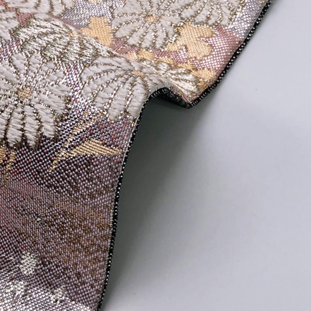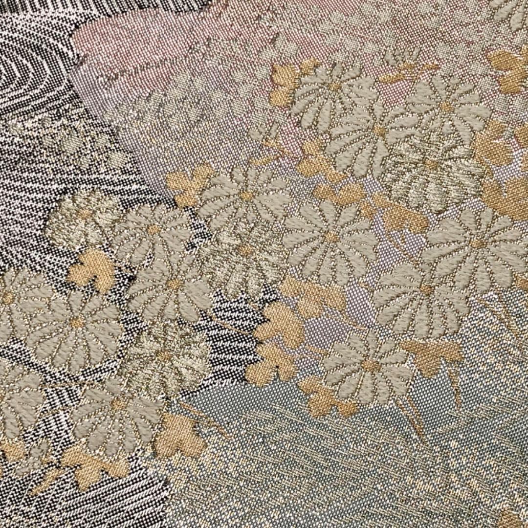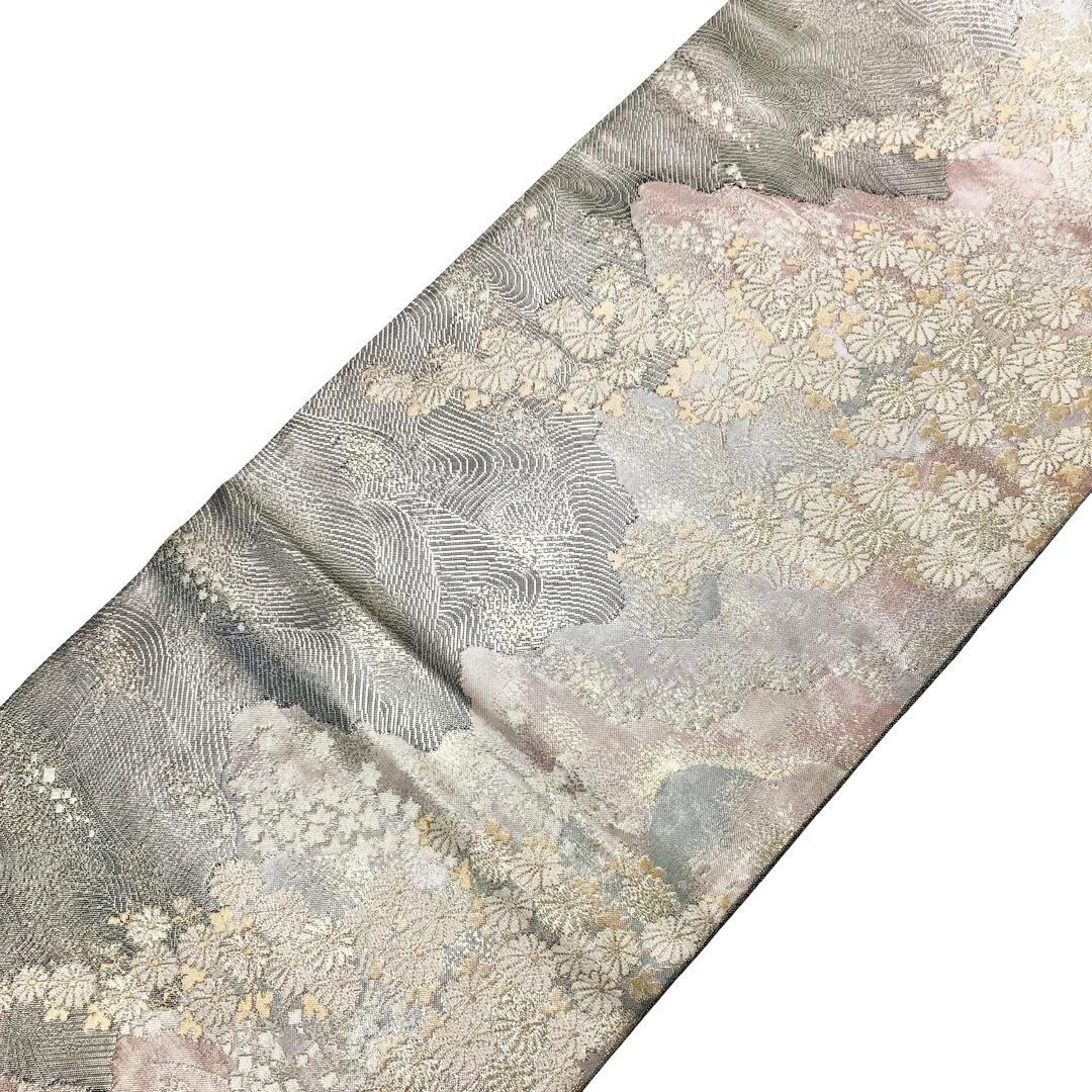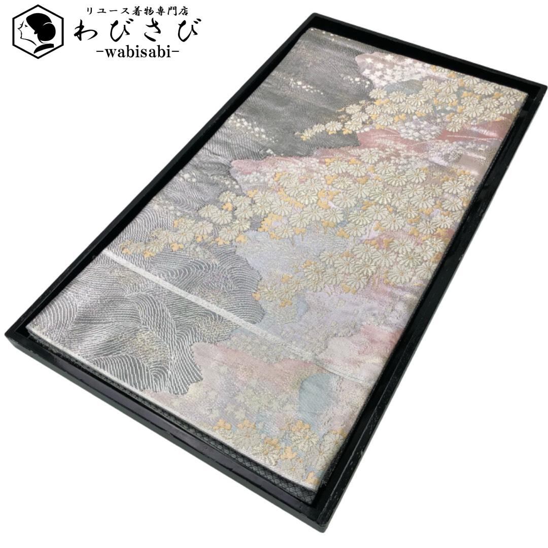 袋帯 流水に花模様 金銀糸 銀色 O-6097 着物 きもの kimono 和服 和装 中古 リサイクル着物 【送料無料】