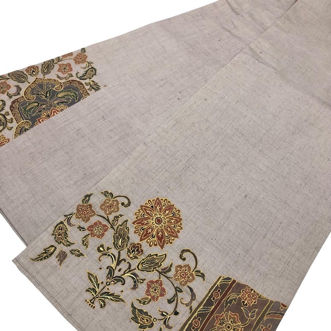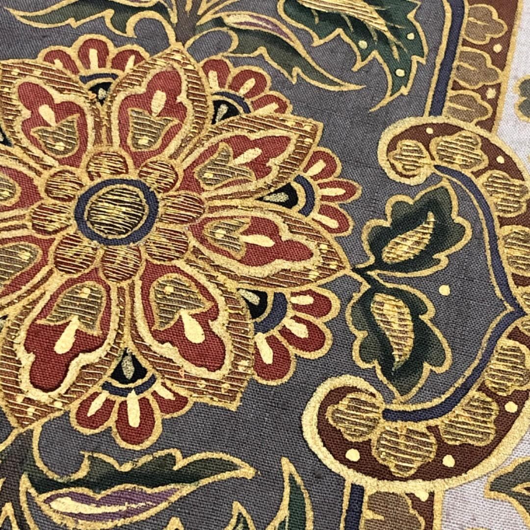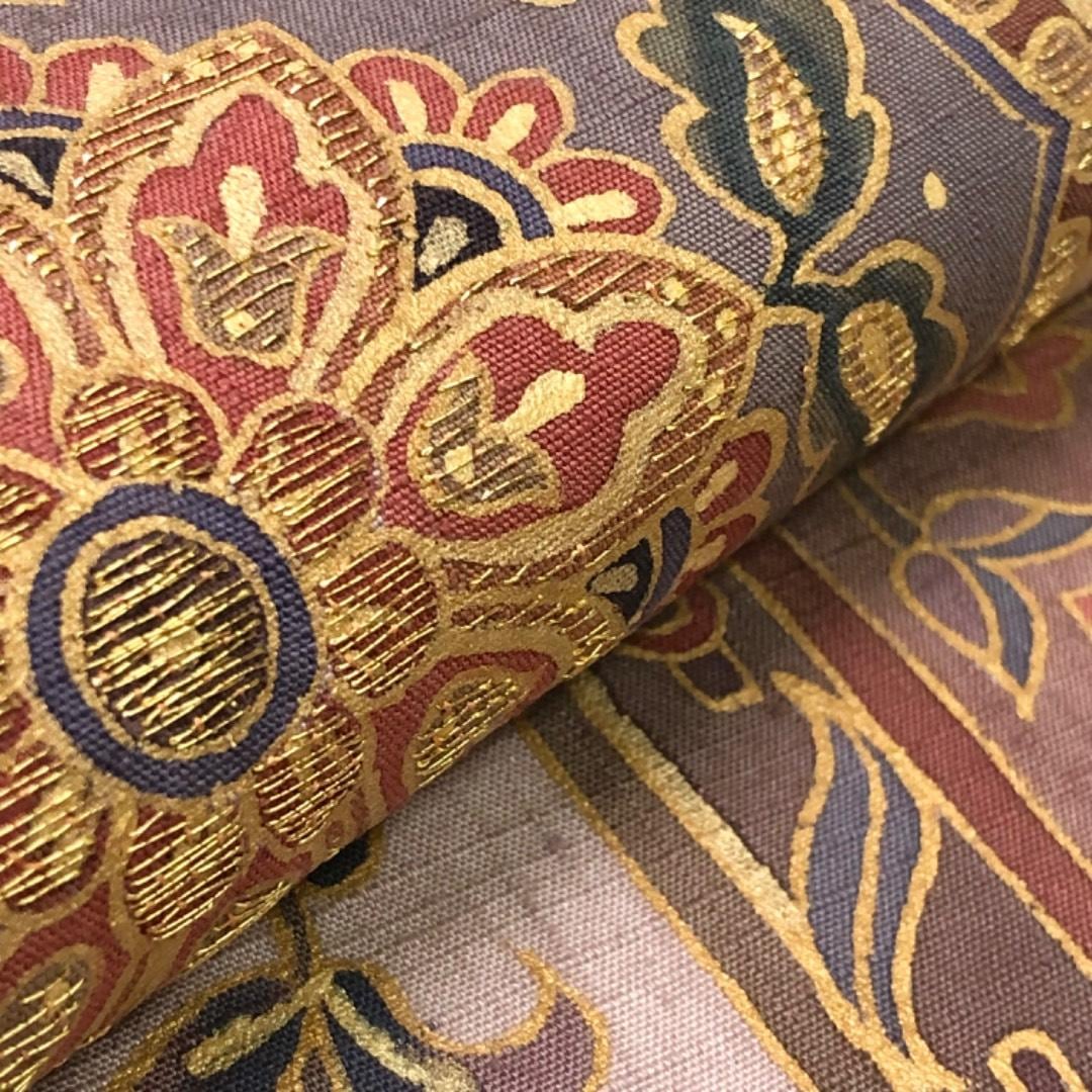 鴇鼠色ベースのお色の紬地に金彩が使われた染柄の花唐草模様がデザインされた雰囲気の良い素敵なお品でございます。