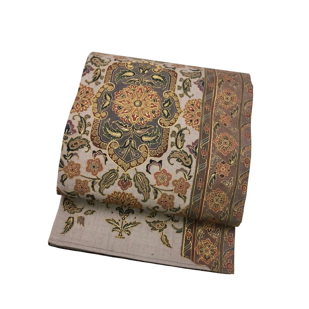 袋帯 紬 花唐草模様 金駒刺繍 鴇鼠色 金彩 O-6111 着物 きもの kimono 和服 和装 中古 リサイクル着物 【送料無料】