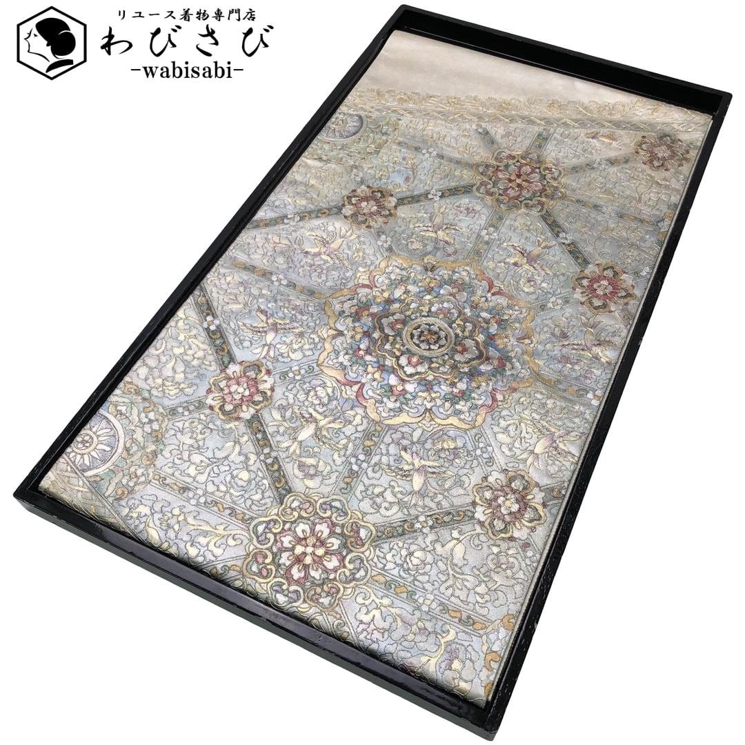 袋帯 鳥に煌びやかな華柄模様 金銀彩 銀色 O-6112 着物 きもの kimono 和服 和装 中古 リサイクル着物 【送料無料】