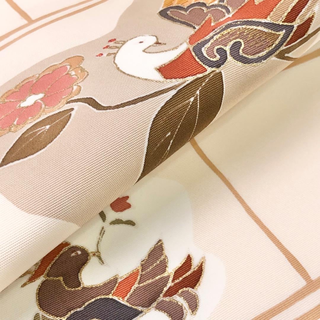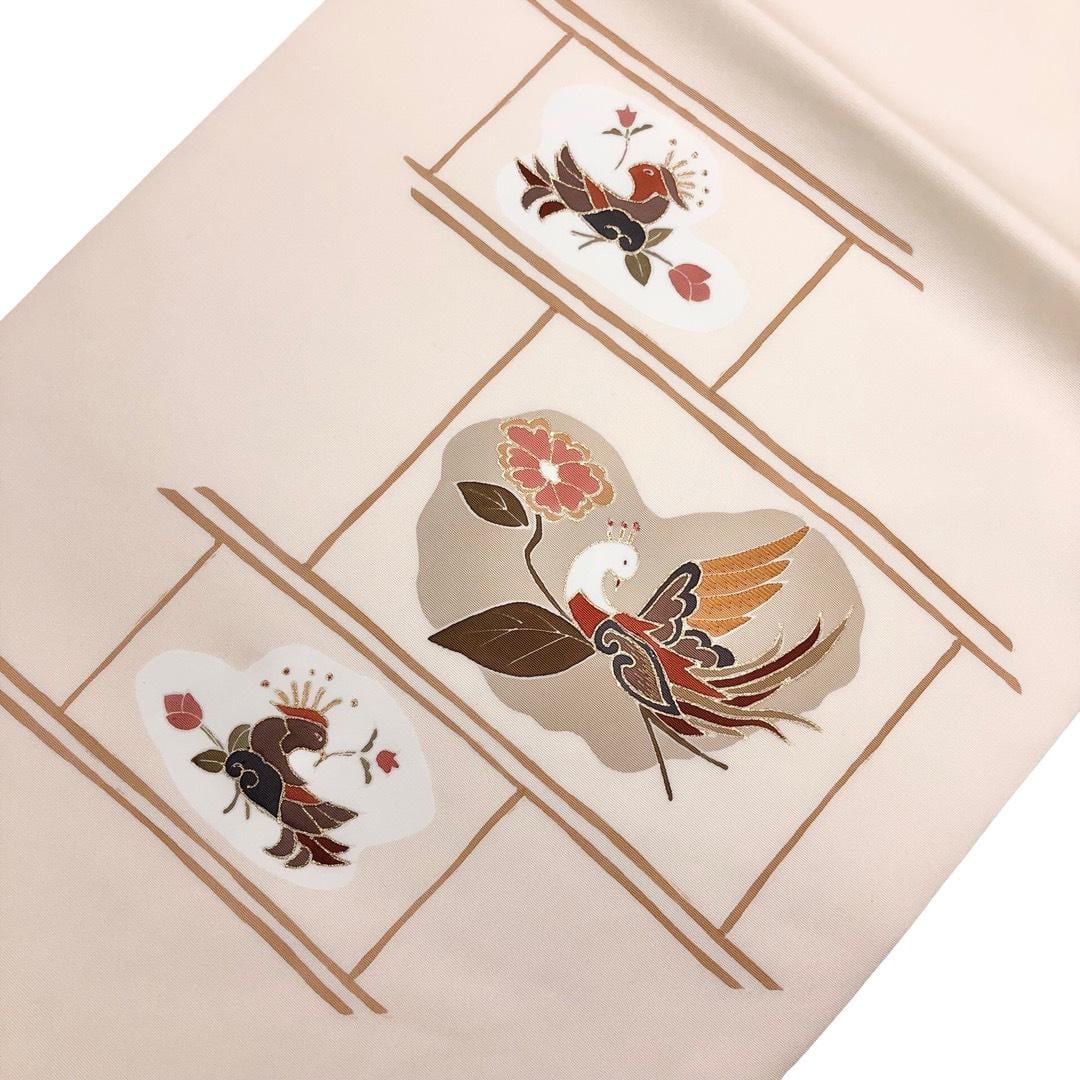 名古屋帯 塩瀬 鳥に花模様 刺繍 金糸 金彩 乳白色 O-6139 着物 きもの kimono 和服 和装 中古 リサイクル着物 【送料無料】