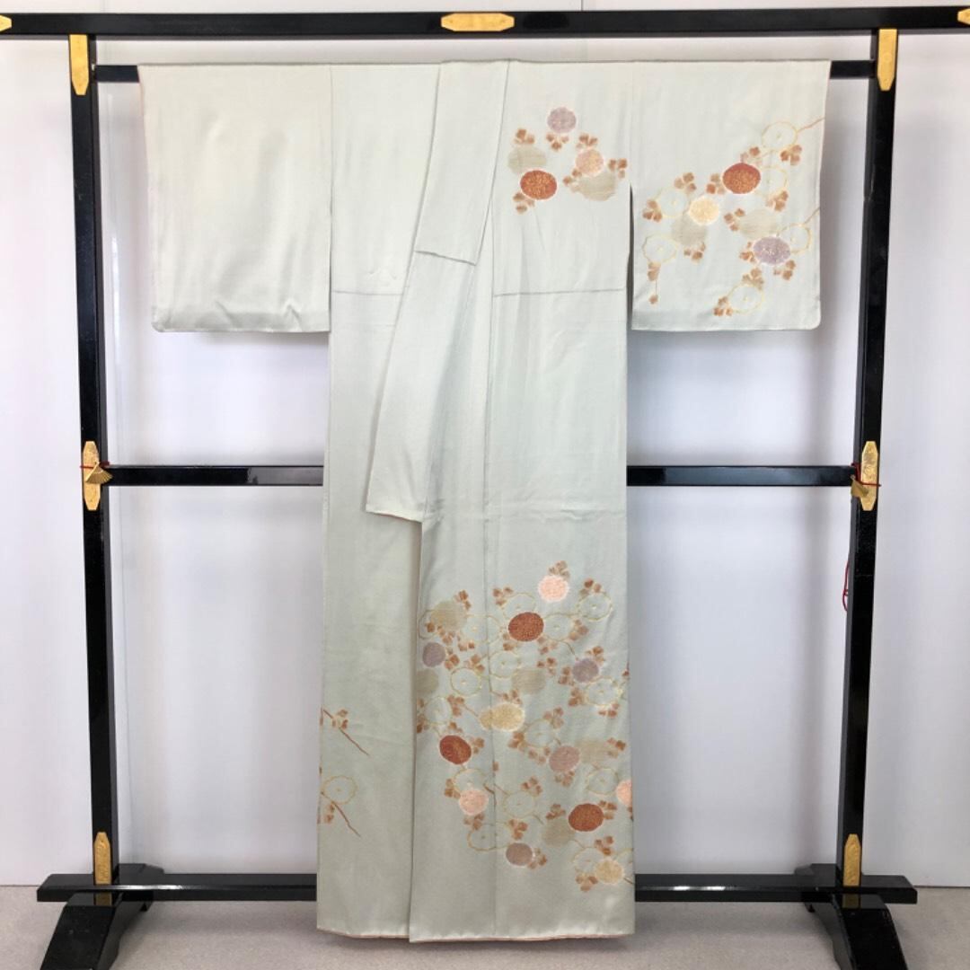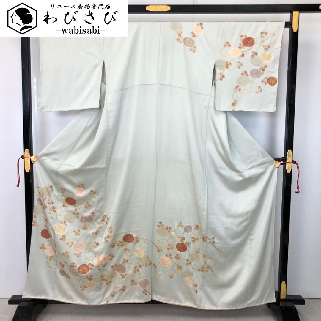 訪問着 万寿菊 金彩 紗綾形 薄白緑色 ふくよかサイズ K-5864 着物 きもの kimono 和服 和装 中古 リサイクル着物 【送料無料】