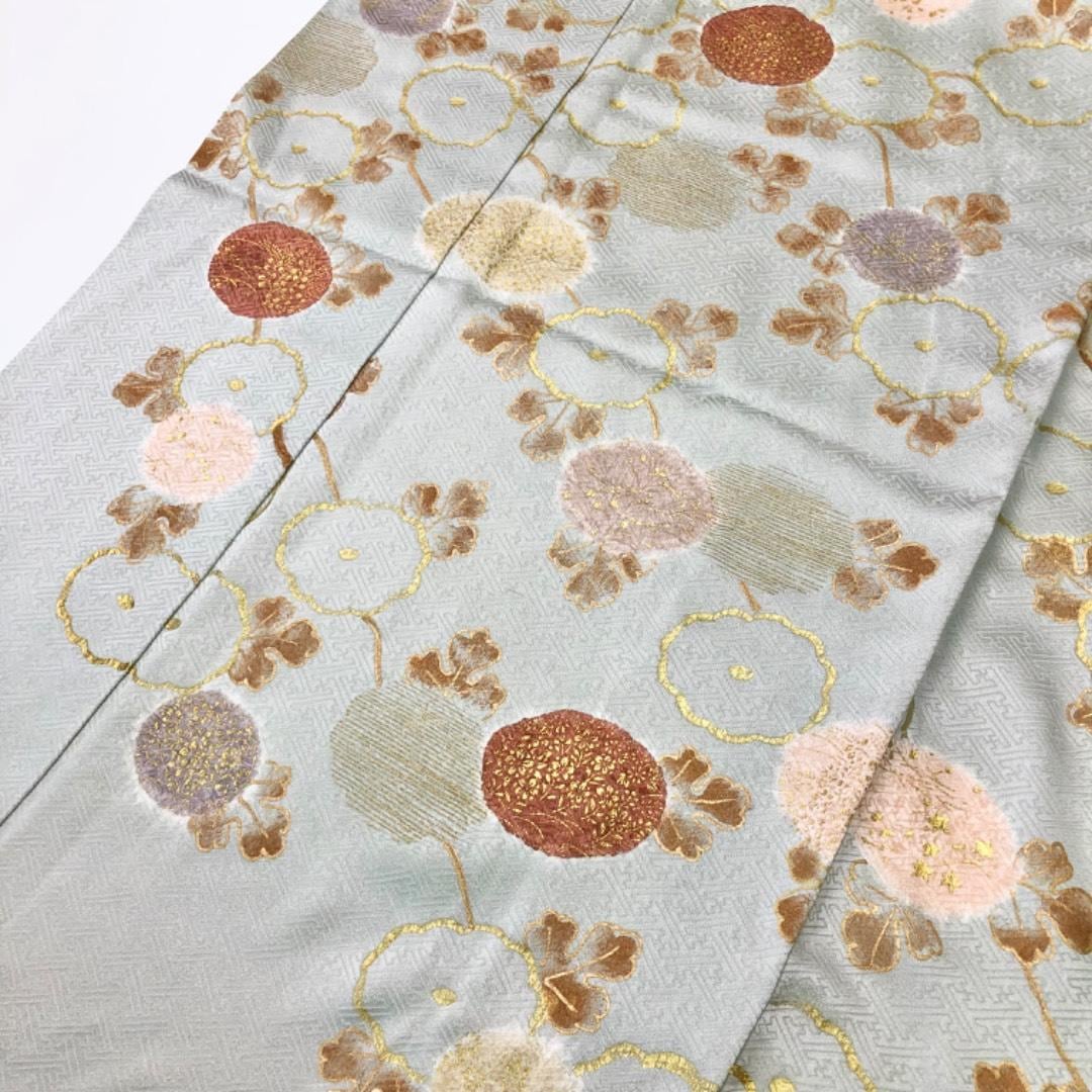 薄白緑色の上品なお色味に紗綾形の地模様、金彩が使われた万寿菊がデザインされた品のある素敵なお品でございます。