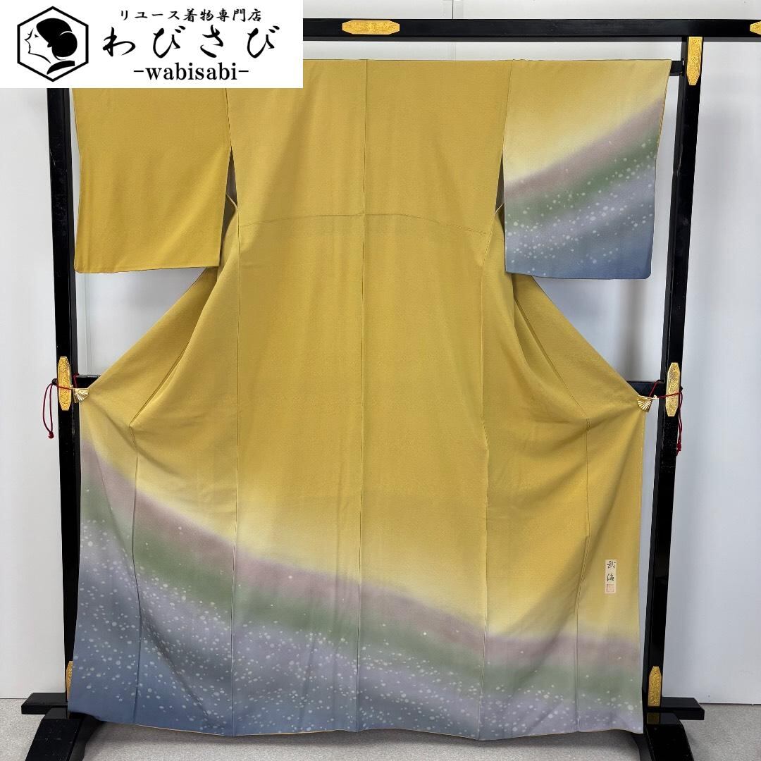 付下げ 作家物 染分け 水玉模様 唐金色 縮緬 K-5875 着物 きもの kimono 和服 和装 中古 リサイクル着物 【送料無料】