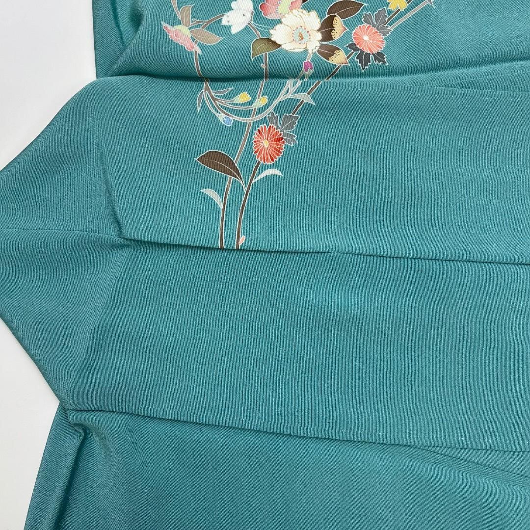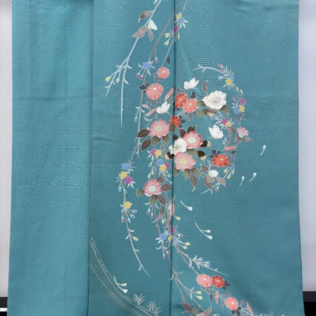 訪問着 美しい花模様 菊 蝶々 縮緬 水浅葱色 トールサイズ K-5873 着物 きもの kimono 和服 和装 中古 リサイクル着物 【送料無料】