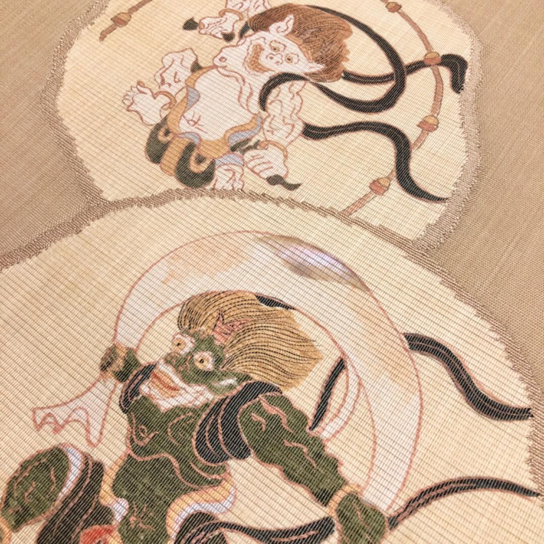 胡桃色のお色味に和紙に桐の皮を貼った糸、真綿の細糸で手のかかった技法で織られた風神雷神の柄行がデザインされた雰囲気の良い素敵なお品でございます。