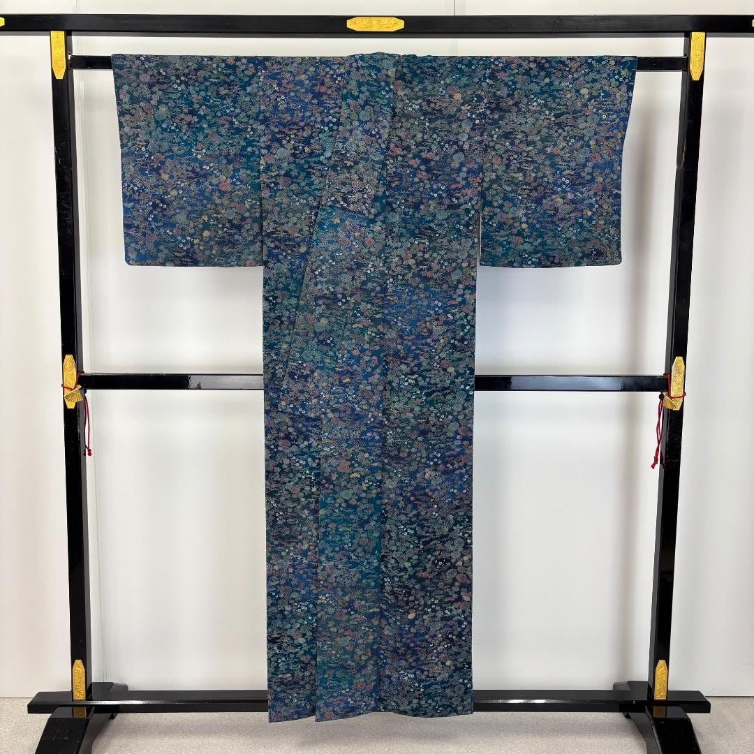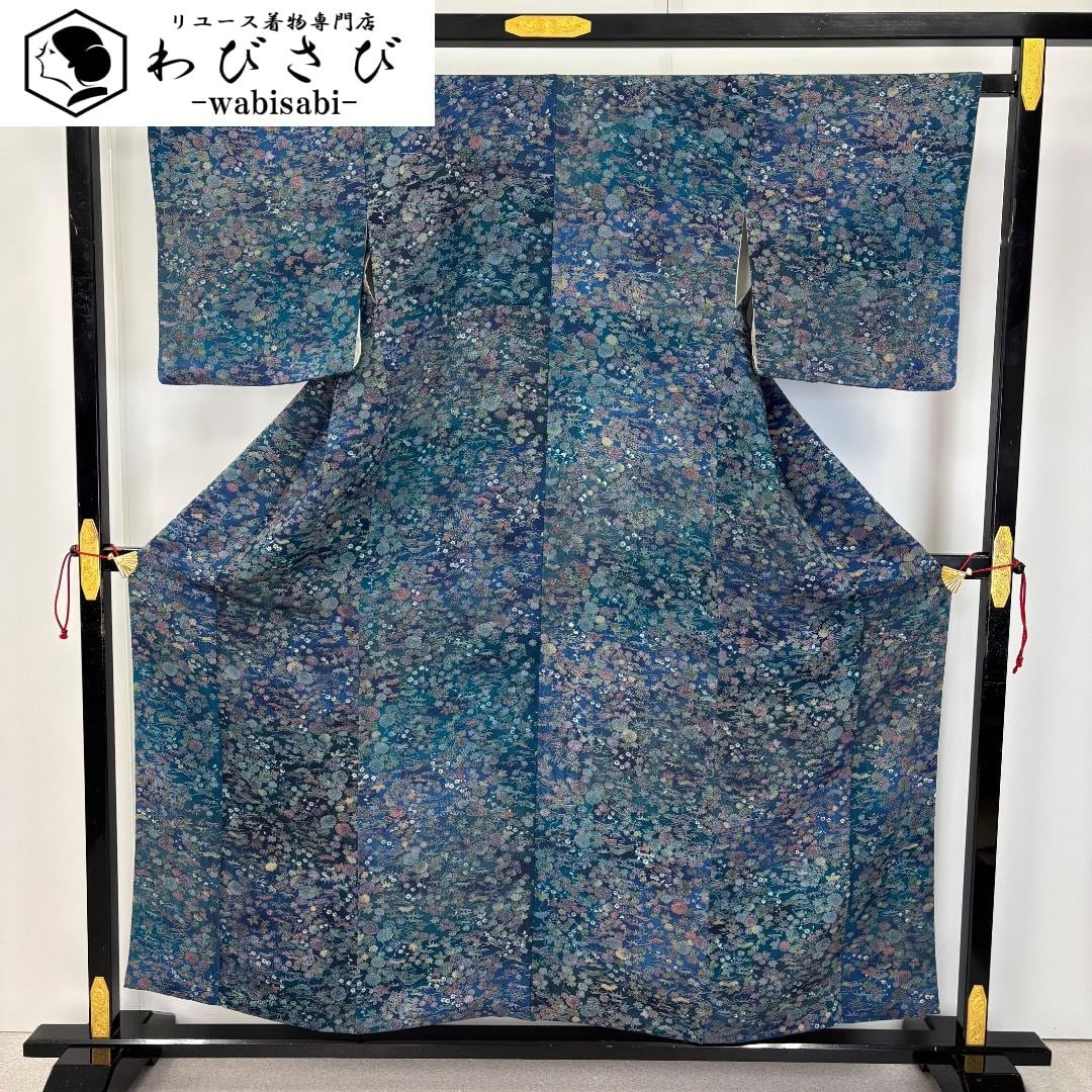小紋 花模様 松 菊 暈し 縮緬 青黛色 K-5877 着物 きもの kimono 和服 和装 中古 リサイクル着物 【送料無料】