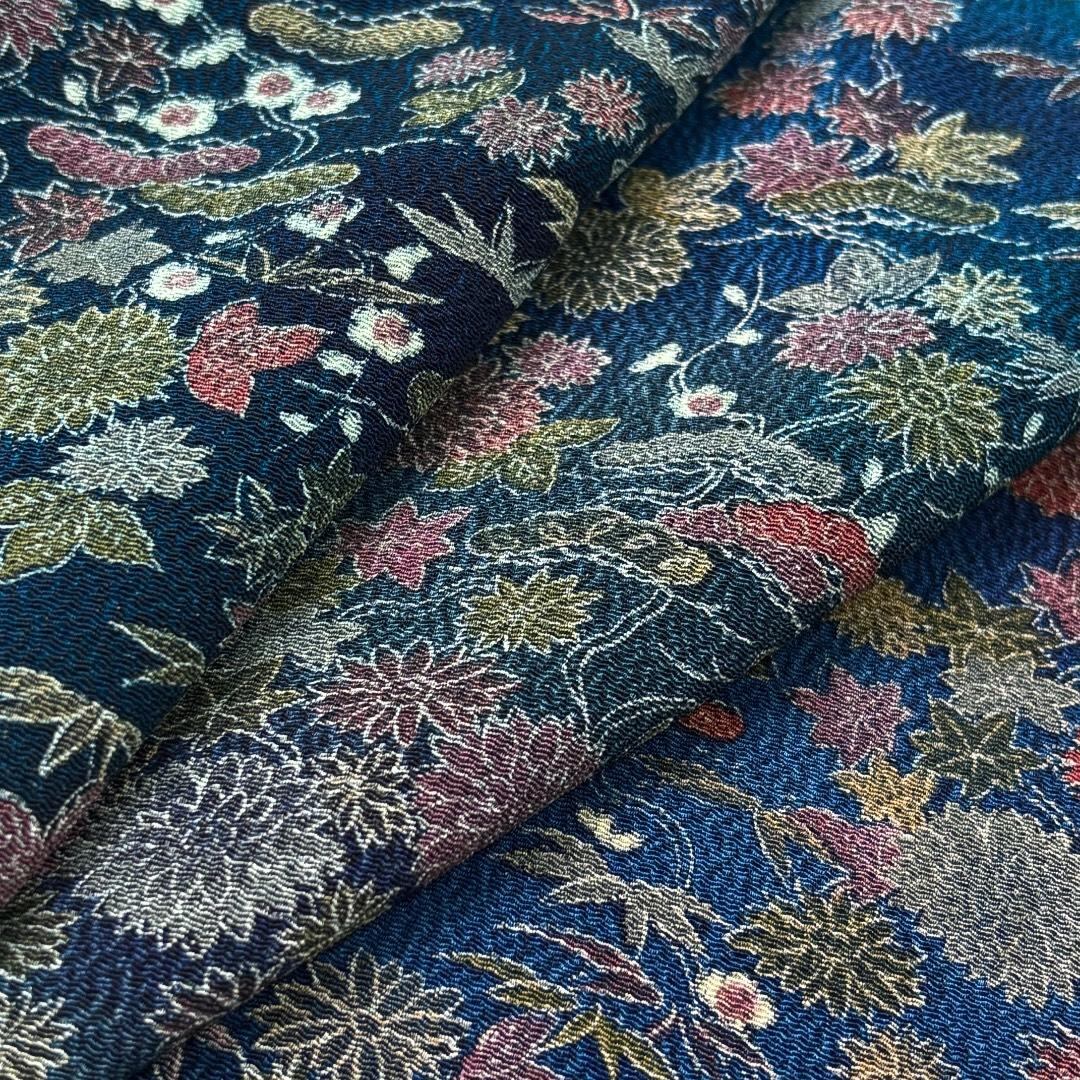 青黛色ベースの雰囲気の良いお色味に暈し、様々な花模様、松などがデザインされた素敵なお品でございます。
