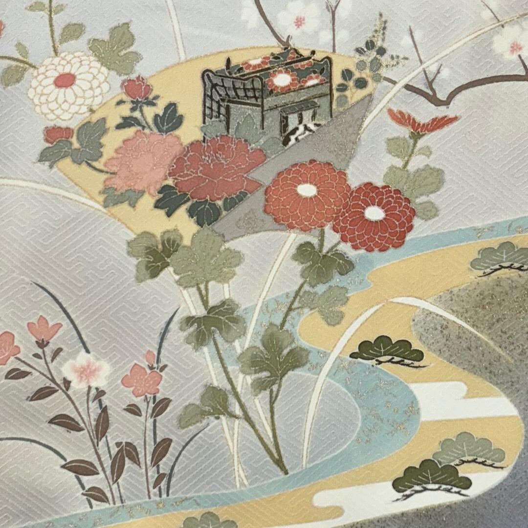訪問着 流水に花模様 御所車 金彩 白鼠色 K-5884 着物 きもの kimono 和服 和装 中古 リサイクル着物 【送料無料】