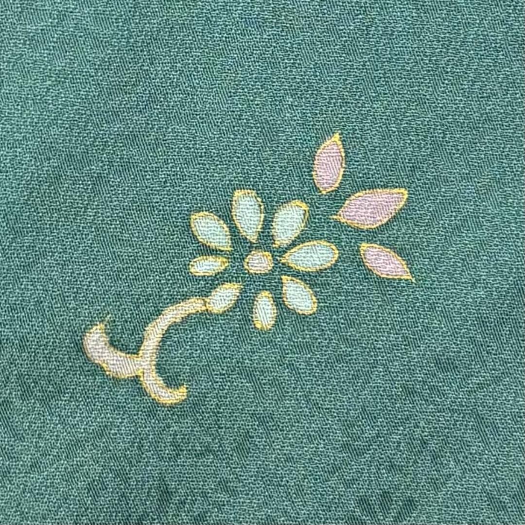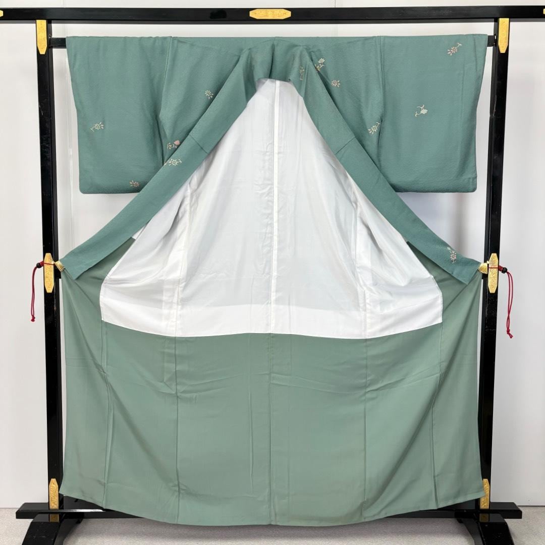 豆青色のお色味に飛び柄の可愛らしい花模様がデザインされた素敵な柄裄のお品でございます。