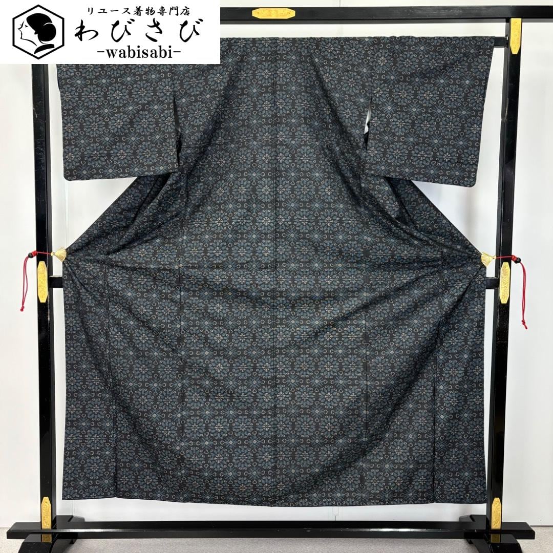 本場大島紬 横双絣 抽象華模様 黒色 K-5890 着物 きもの kimono 和服 和装 中古 リサイクル着物 【送料無料】