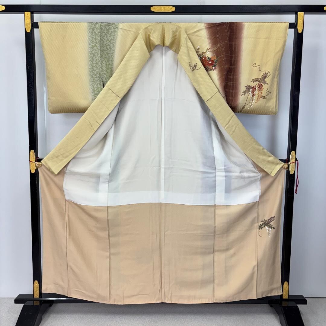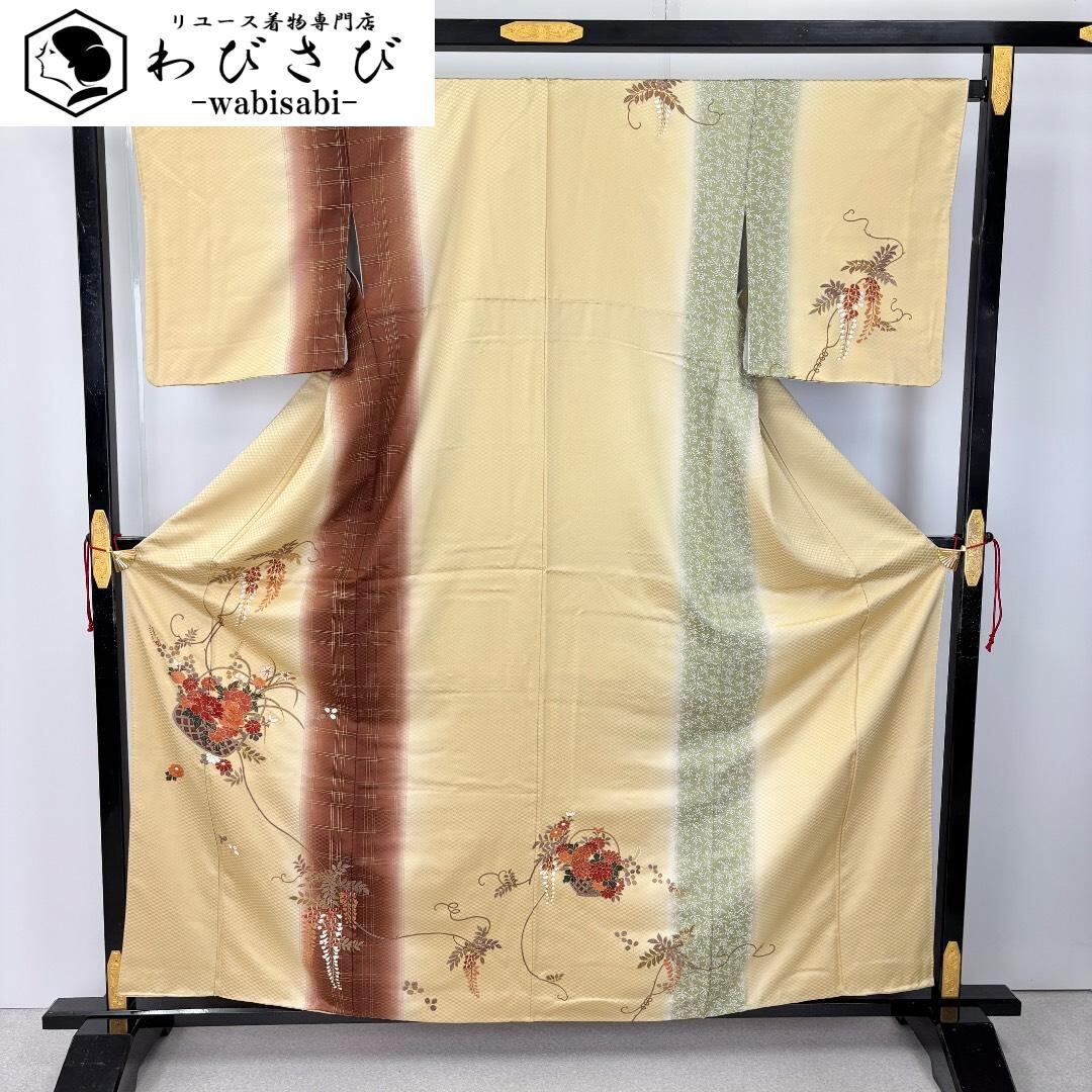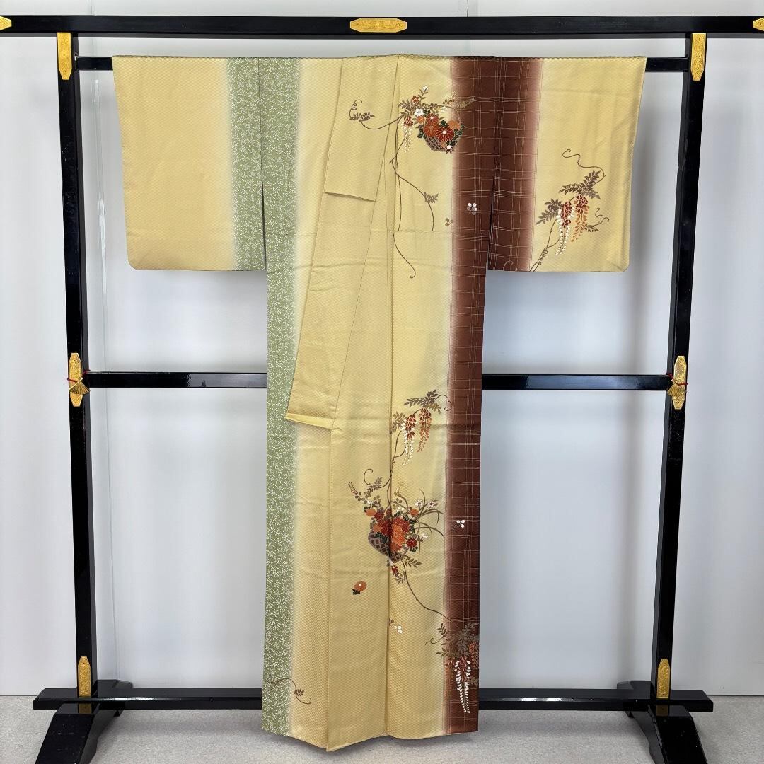 付下げ 花籠 藤の花模様 菊 萩 暈し 牙黄色 K-5893 着物 きもの kimono 和服 和装 中古 リサイクル着物 【送料無料】