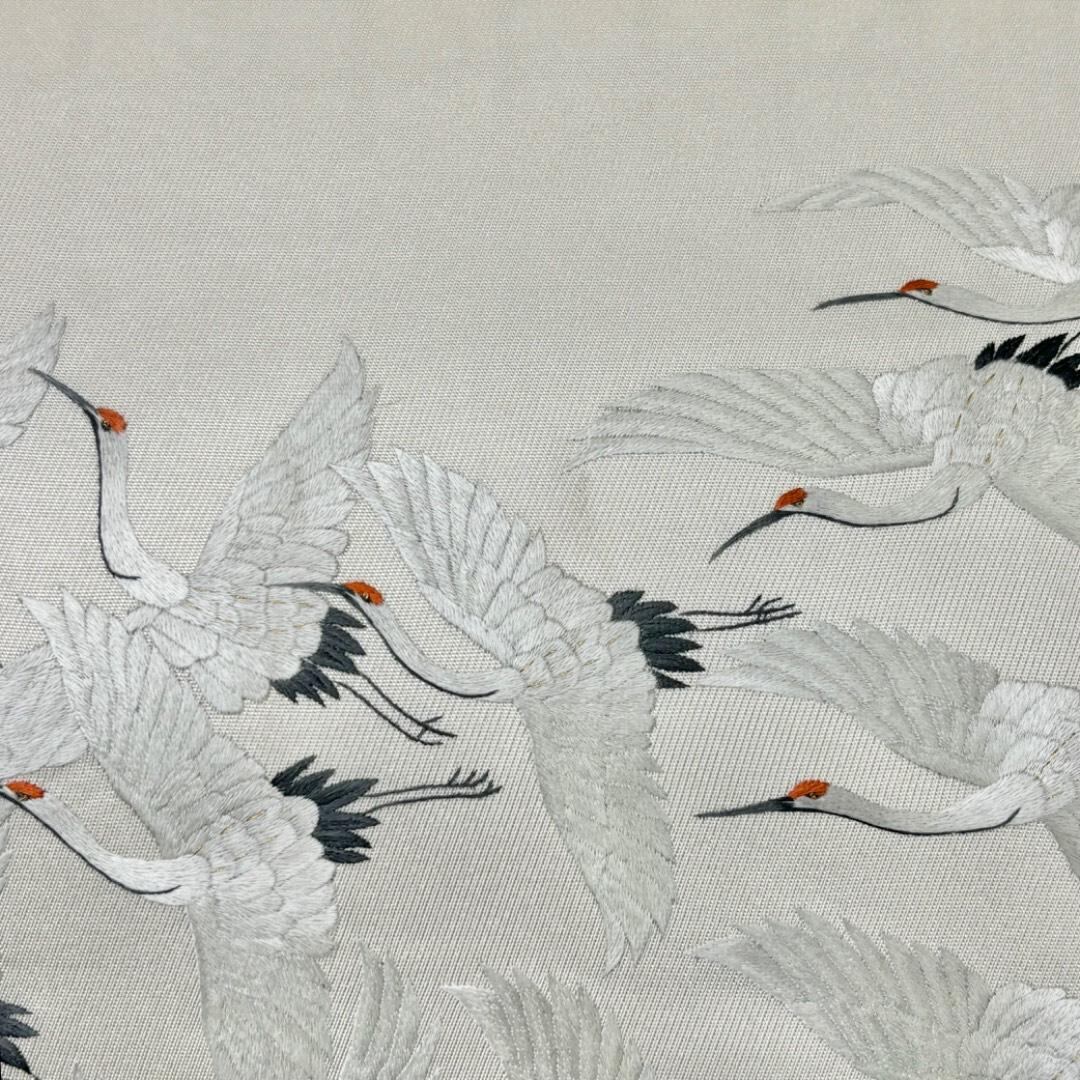 灰白色の上品なお色味に最高峰の技術を誇る蘇州刺繍の第一人者蒋雪英の蘇州刺繍の美しい飛翔鶴がデザインされた素敵な柄裄のお品でございます。